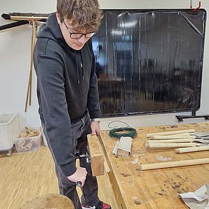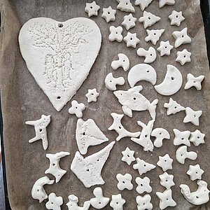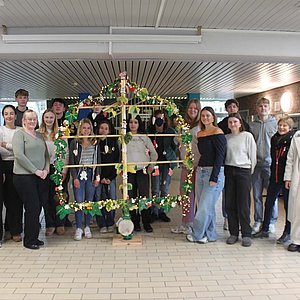 Noch nie etwas davon gehört? Auf Föhr und Amrum heißt dieser „Kenkenbuum“ und die Sylter Friesen nennen ihn „Jöölboom“. Diese Weihnachtstradition ist Mitte des 19. Jahrhunderts entstanden. Die SchülerInnen der jetzigen EOa zimmerten zusammen mit Herrn Schilder das Gestell - bestehend aus einem senkrechten Holz mit waagerechten Hölzern und eine Baumform darstellend. Der Bogen besteht aus Draht und wurde mit selbstgefilzten Efeublättern begrünt. An diese hängten die Schülerinnen und Schüler als „Kenkentjüch“ bekannte Figuren aus Salzteig (Hahn-steht für Wachsamkeit; Pferd-Ausdauer, Hund-Treue, Fisch/Segelschiff-Lebensgrundlage und am Fuße des Baums Adam und Eva mit dem Apfelbaum und der Schlange.) Die SchülerInnen entschieden sich auch für Variationen ihrer Wahl.