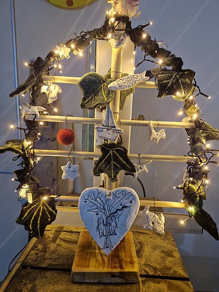 Der Jöölboom ist jedes Jahr wieder verwendbar und mit seinen Salzteigfiguren ohne Plastik sehr umweltfreundlich. Die Weihnachtsdekoration ist in jeder Größe möglich und kann auch selbst angefertigt werden.