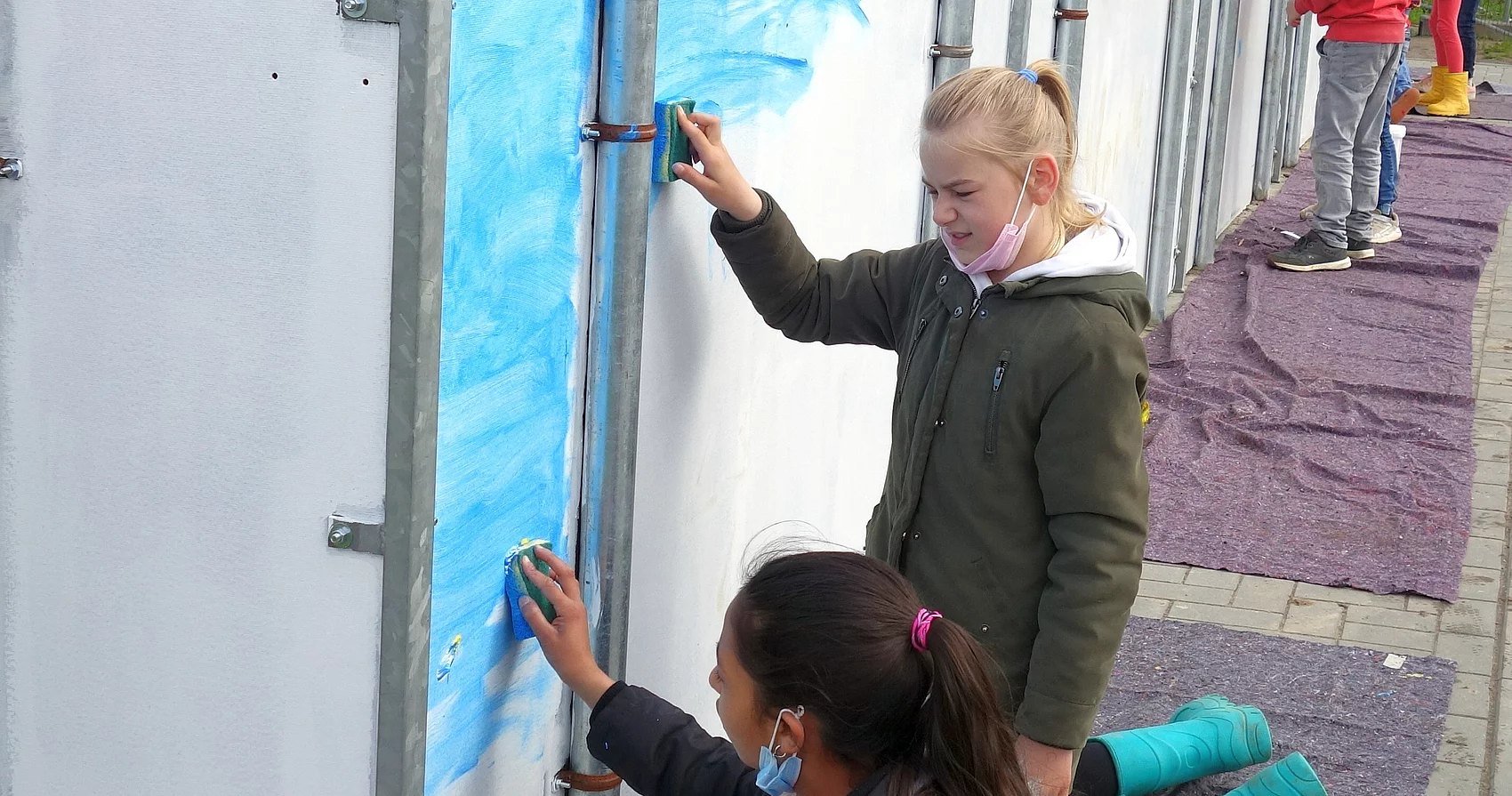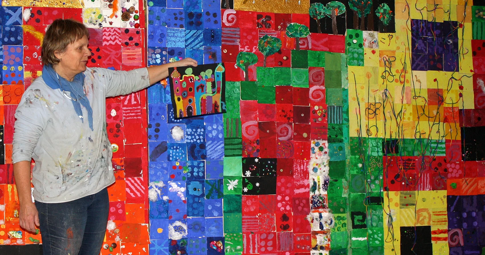 Wann kann man großflächige Kunstwerke erstellen? Mit unseren den 3. und 4. Klassen werden in regelmäßigen Abständen Kunstprojekte mit Künstlerinnen aus der Region durchgeführt. Finanzielle Unterstützung findet die Schule hier bei der Bildungskette und dem Förderverein der Schule. Inge Nagel, Künstlerin aus Büsumer Deichhausen, unterstützt die Kunstlehrerinnen Doris Hahn und Almuth Kern gerne und tatkräftig bei solchen Projekten.