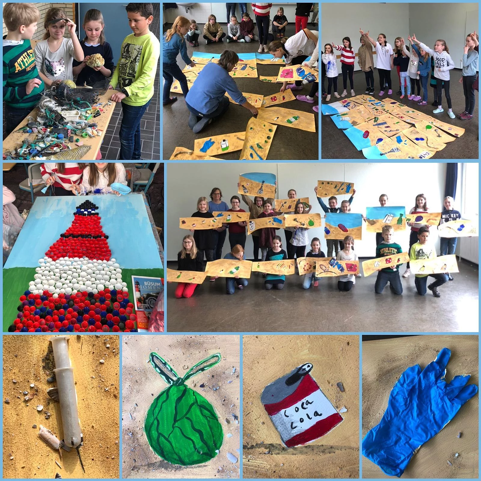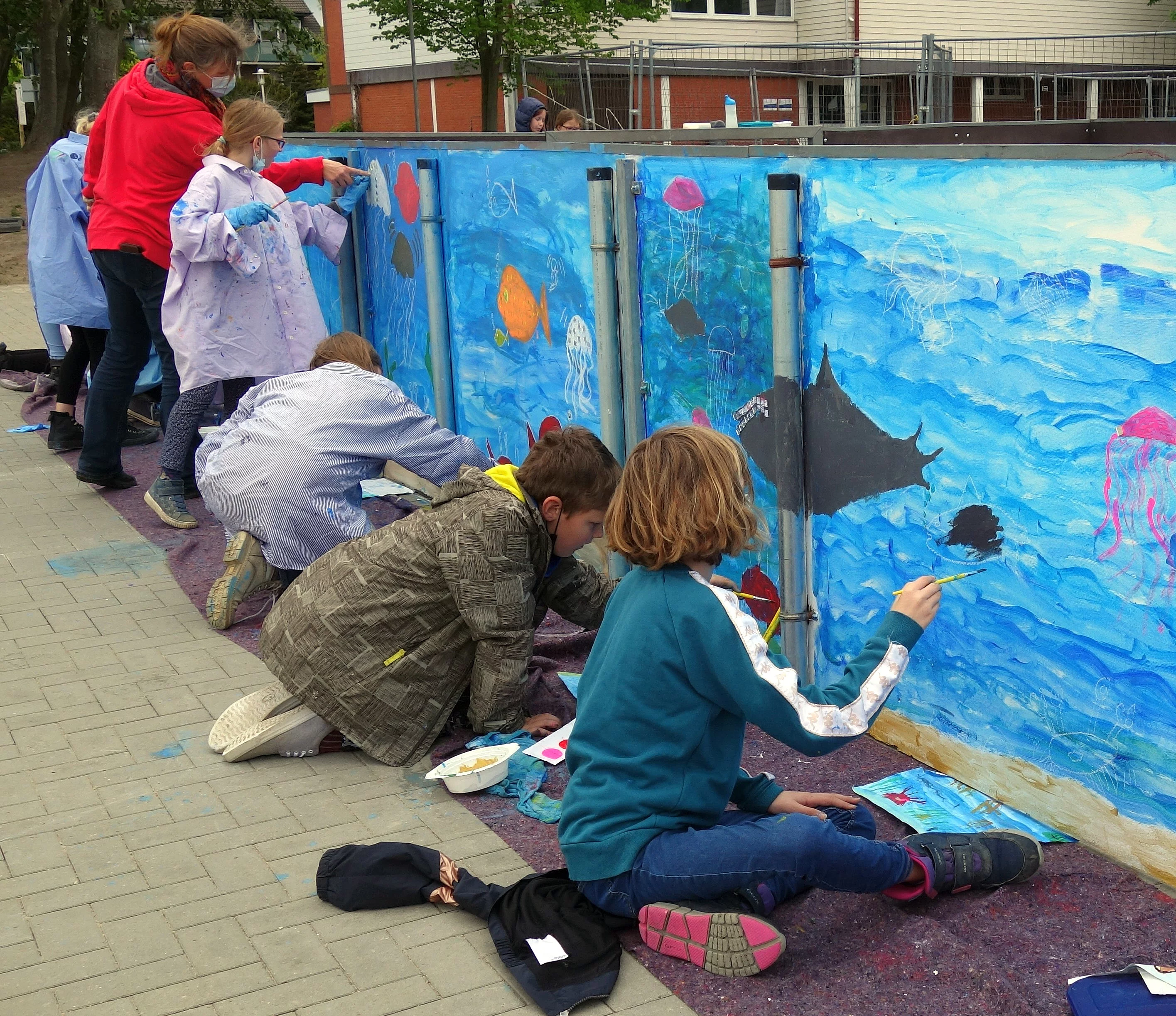 So wurde gemeinsam ein Konzept für zwei Hundertwasserprojekte entwickelt, gleichzeitig auch eines zum Thema „The small five and the big five“ aus dem Nationalpark Wattenmeer. Hierbei handelt es sich um kleine und größere im Wattenmeer lebende Tiere, z.B. Garnelen, Krebse, Wattwürmer, Schweinswale, Seehunde und Silbermöwen. Auch das Streetsoccer-Feld auf dem Schulhof wurde in eine Aquariumswelt verwandelt. Alle Kinder arbeiten bei diesen Projekttagen stets mit großer Begeisterung mit. Es ist immer ein besonderes Erlebnis, einmal mit ganz anderen Materialien zu arbeiten und gleichzeitig auch so viel fachkundige Unterstützung zu erhalten. Neben dem Malen erhalten die SchülerInnen aber auch ganz viele Informationen über Maltechniken, Farbkreislehre sowie über den Beruf eines Künstlers. Für die Zukunft ist auch der Besuch einer Kunstausstellung geplant.