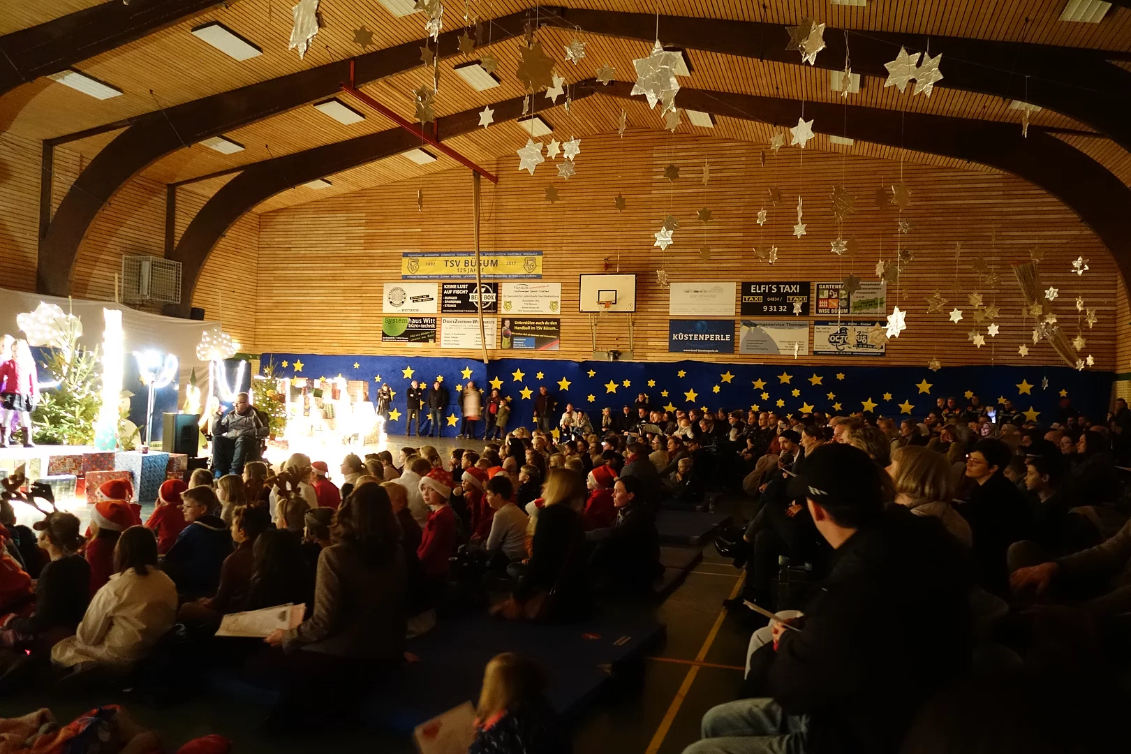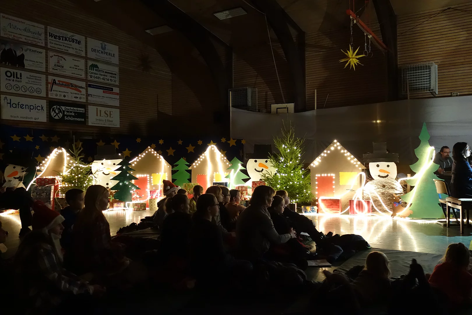 Kurz vor der Veranstaltung verwandelt sich die Mehrzweckhalle dank vieler helfender Hände, darunter auch die der Eltern und Freunde der Schule am Meer, in ein zauberhaftes Winterdorf mit Bühne. Die Aufregung der Kinder steigt, wenn sich die Plätze füllen, das große Licht ausgeht und die Halle festlich dekoriert und stimmungsvoll erstrahlt. Dann wächst auch die Vorfreude auf Weihnachten und die Ferien. Für das leibliche Wohl ist ebenfalls gesorgt, denn die Zuschauer können sich in der Pause vor der Halle mit Speisen und Getränken versorgen. Außerdem winken tolle Preise bei der Tombola.