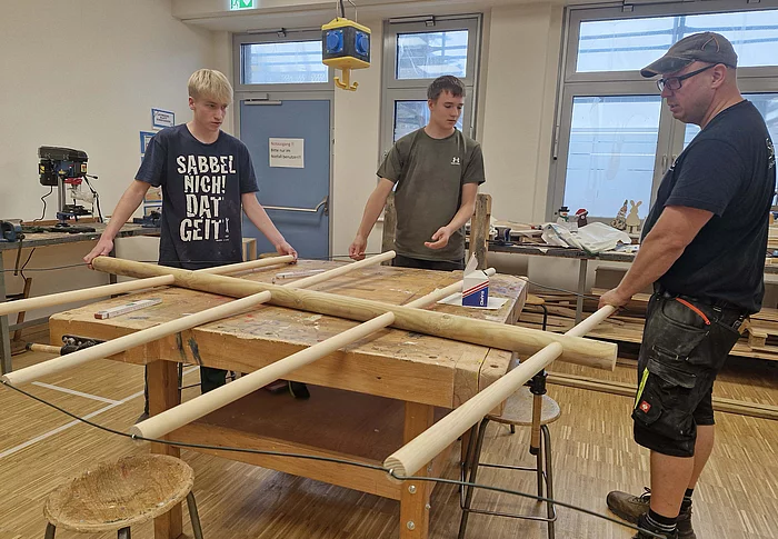 Klaas Neumann, Jonas Wieben, Finn Ufen und Till Hadel aus der 9b haben mit unserem Hausmeister Henning Meister zwei große Jöölboome gezimmert. Diese werden bald außeerhalb der Schule am Meer für weihnachtliche Vorfreude sorgen.