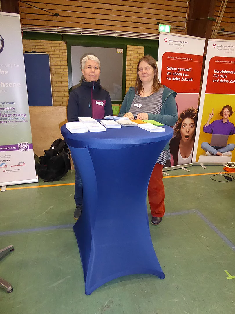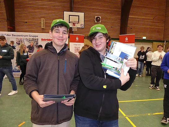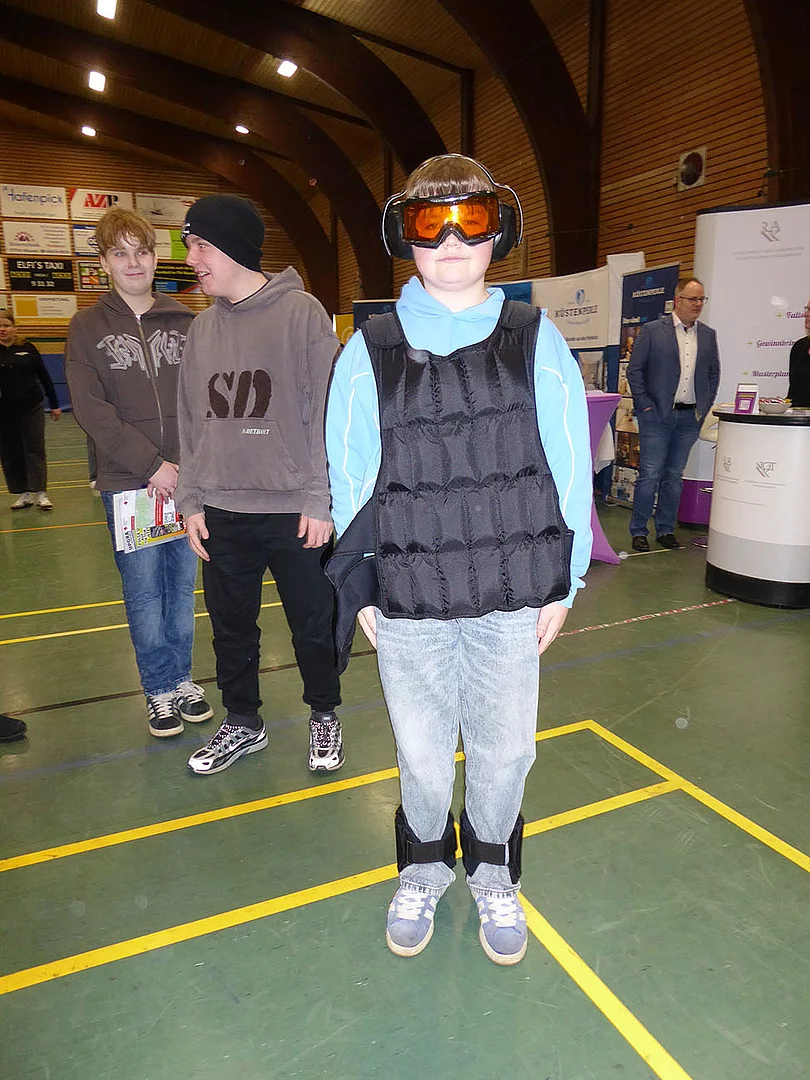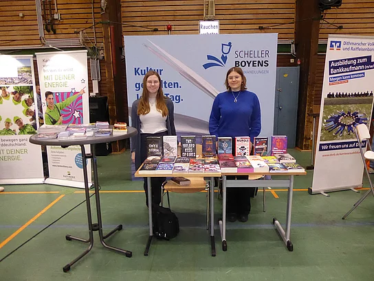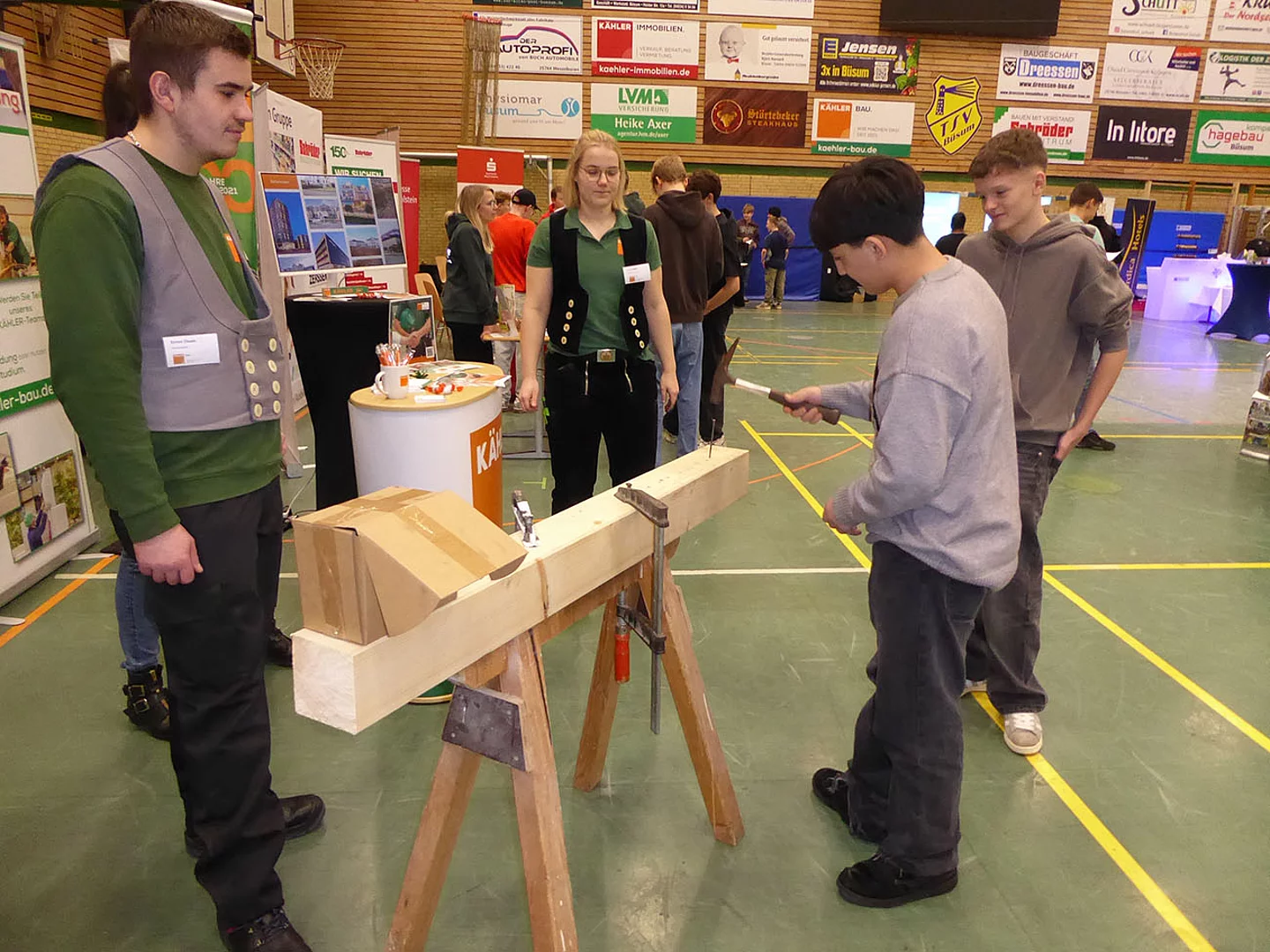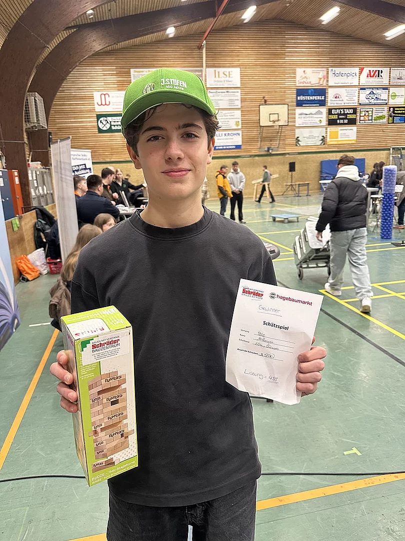 Zum ersten Mal dabei war ein Team von Schröder Bauzentrum. Ausbildungsleiterin Nicole Diercks zeigte sich sehr zufrieden: „Unser Besuch als Aussteller auf der Berufsmesse an der Schule am Meer in Büsum war erfolgreich – viele interessierte Gespräche, motivierte Schüler und eine tolle Gelegenheit, unser Unternehmen vorzustellen. Wir freuen uns darauf, den ersten Kontakt zu vertiefen und den ersten Schüler im Praktikum wieder zu sehen.“ An diesem Stand gab es ein Gewinnspiel zum Mitmachen. Es sollte die Anzahl von Schrauben in einem Glas geschätzt werden. Pelle Mittmann aus der EOa hatte 500 getippt und lag damit am dichtesten dran, denn es waren 488. Er gewann ein Spiel aus Holz.