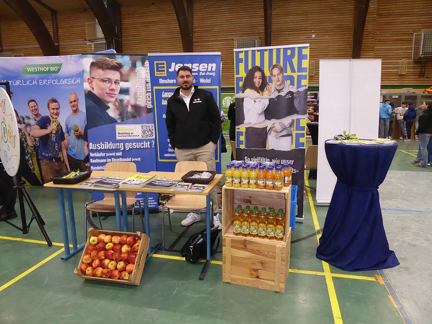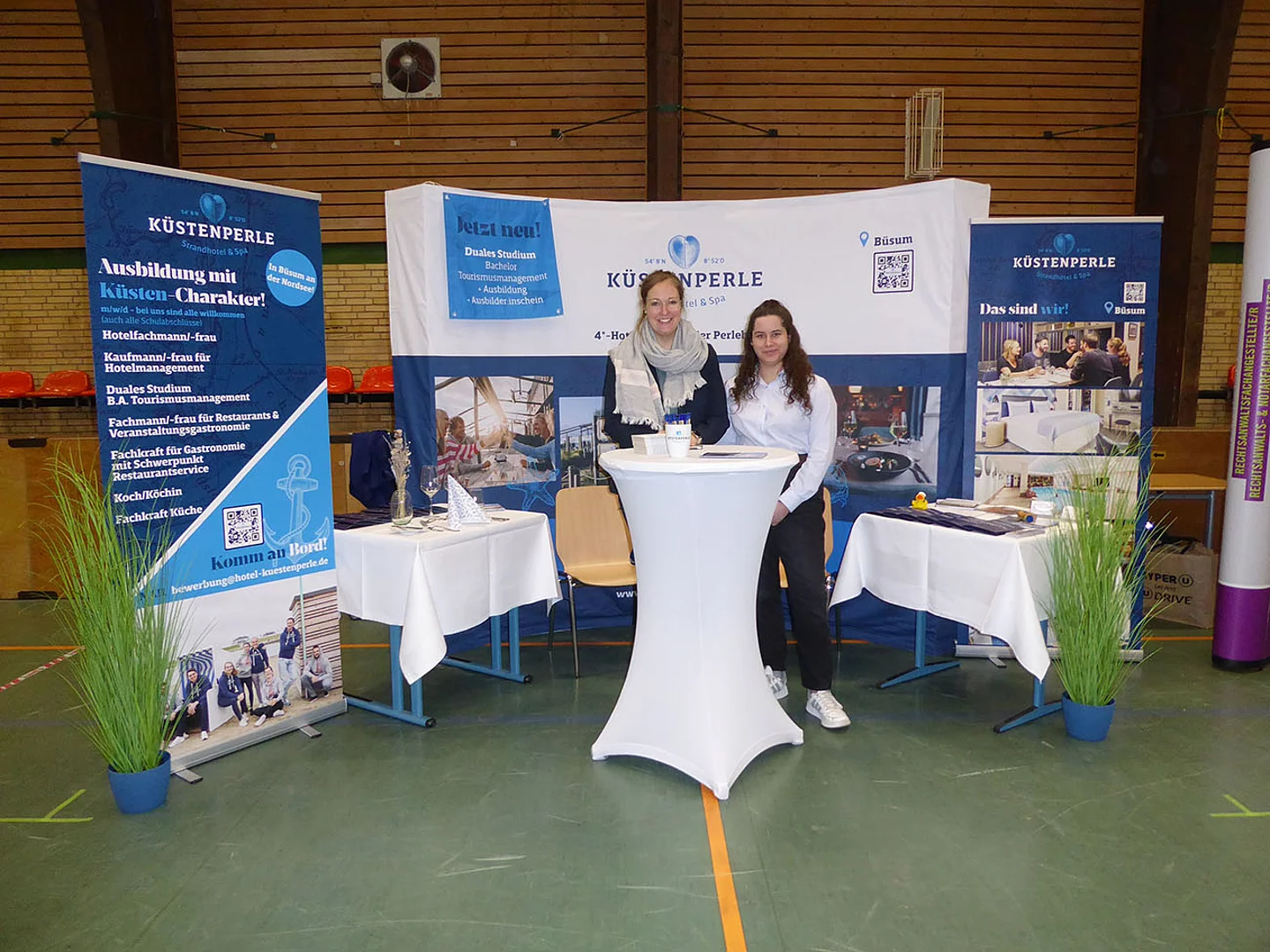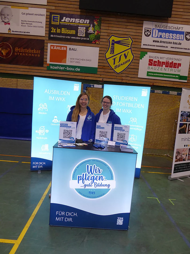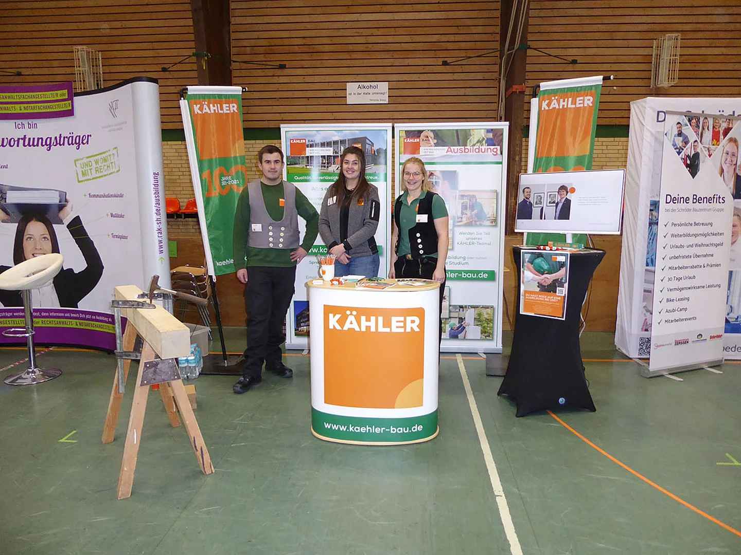 Zum ersten Mal dabei war ein Team von Schröder Bauzentrum. Ausbildungsleiterin Nicole Diercks zeigte sich sehr zufrieden: „Unser Besuch als Aussteller auf der Berufsmesse an der Schule am Meer in Büsum war erfolgreich – viele interessierte Gespräche, motivierte Schüler und eine tolle Gelegenheit, unser Unternehmen vorzustellen. Wir freuen uns darauf, den ersten Kontakt zu vertiefen und den ersten Schüler im Praktikum wieder zu sehen.“ An diesem Stand gab es ein Gewinnspiel zum Mitmachen. Es sollte die Anzahl von Schrauben in einem Glas geschätzt werden. Pelle Mittmann aus der EOa hatte 500 getippt und lag damit am dichtesten dran, denn es waren 488. Er gewann ein Spiel aus Holz.