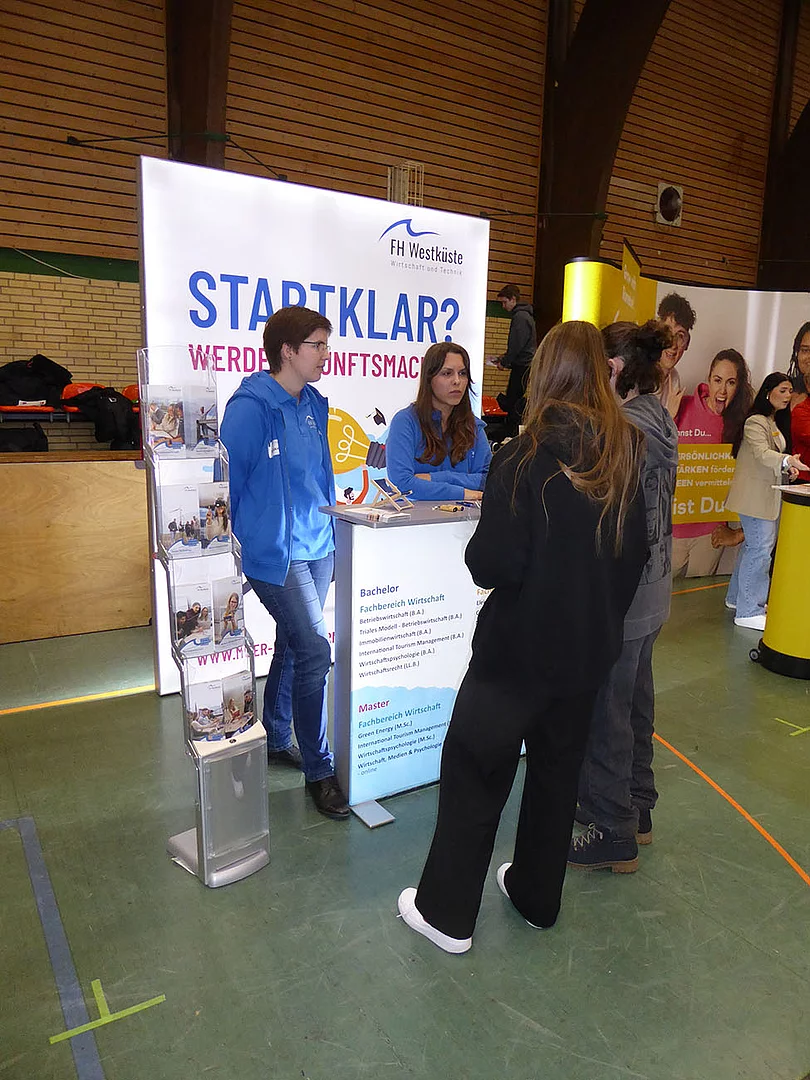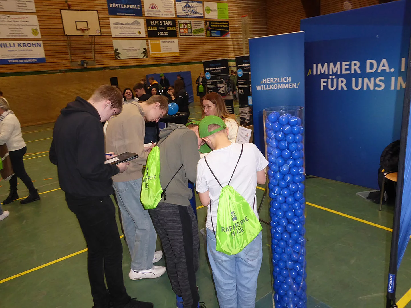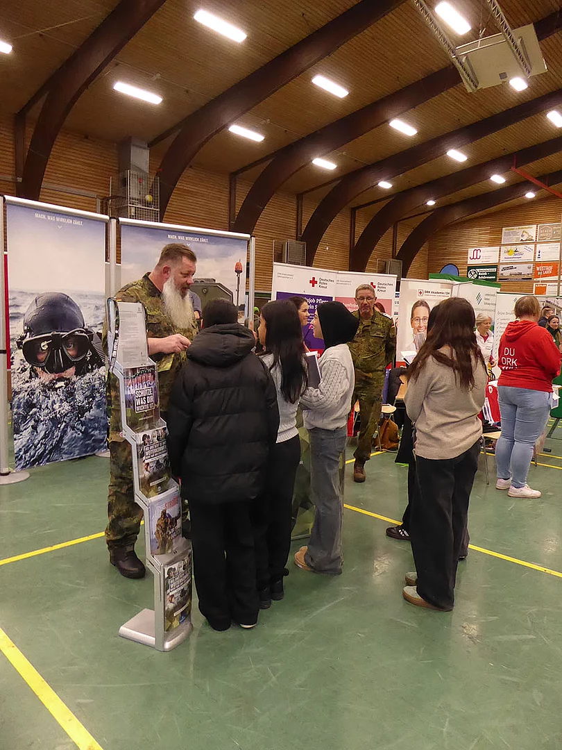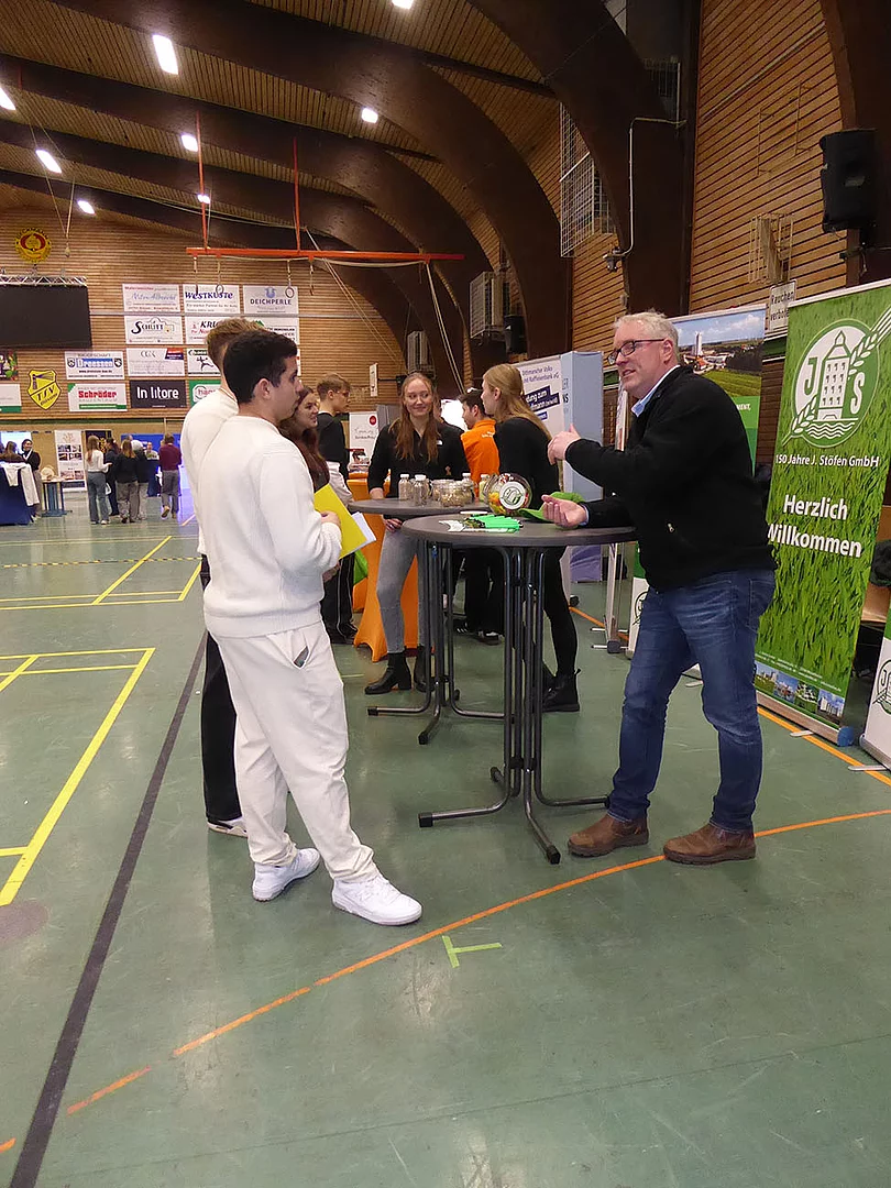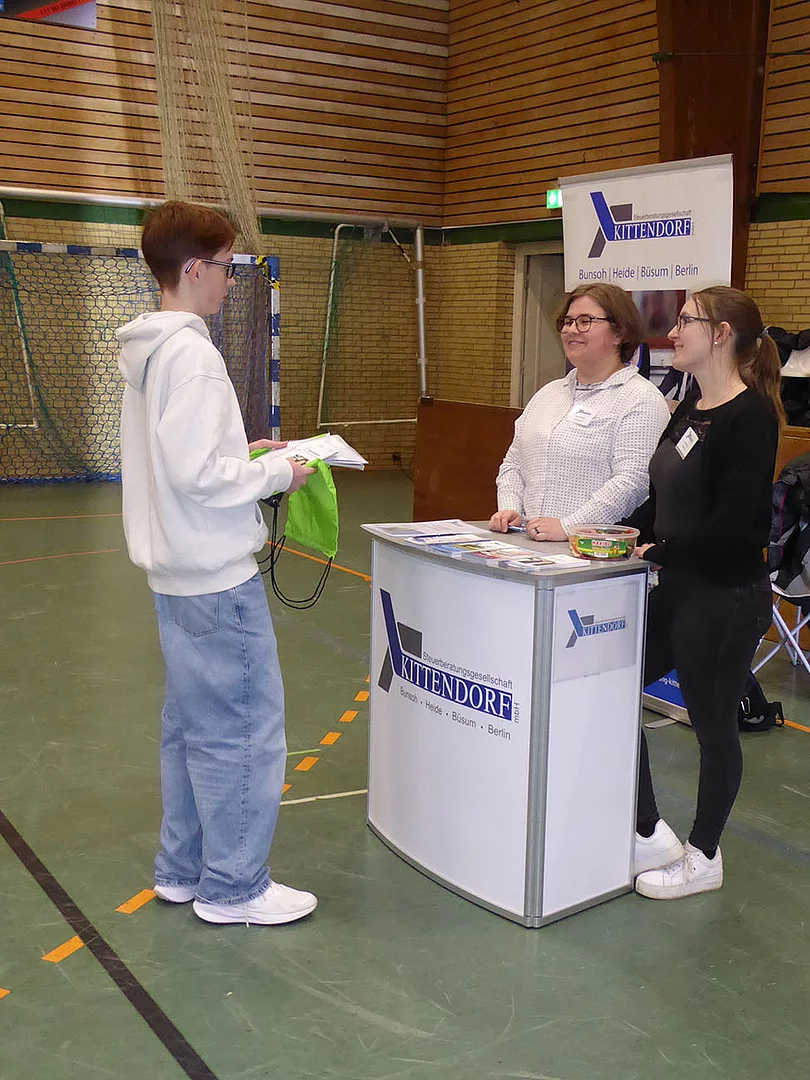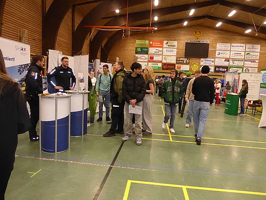 Nach Eröffnung der Berufsmesse durch Schulleiter Kurt Siemund und Bildungskoordinatorin Claudia Brandt, Organisatorin der Messe, besuchten nicht nur Schülerinnen und Schüler mit ihren Lehrkräften die Veranstaltung. Der Einladung gefolgt waren auch einige Eltern sowie der ehemalige Bürgermeister Hans-Jürgen Lütje und sein Nachfolger Oliver Kumbartzky.