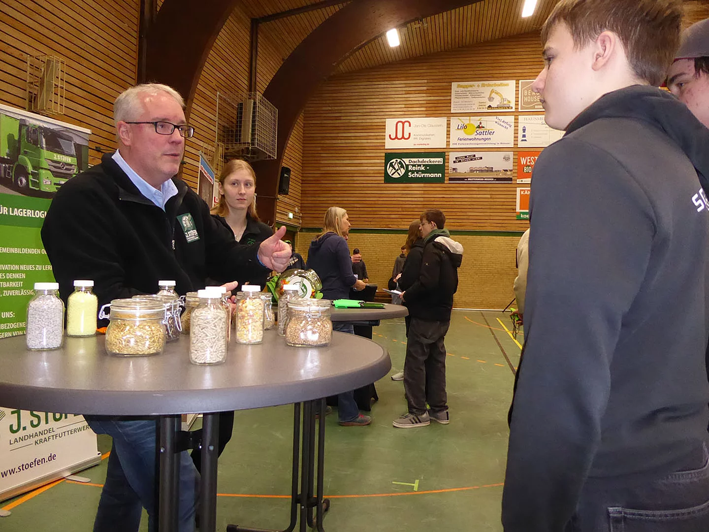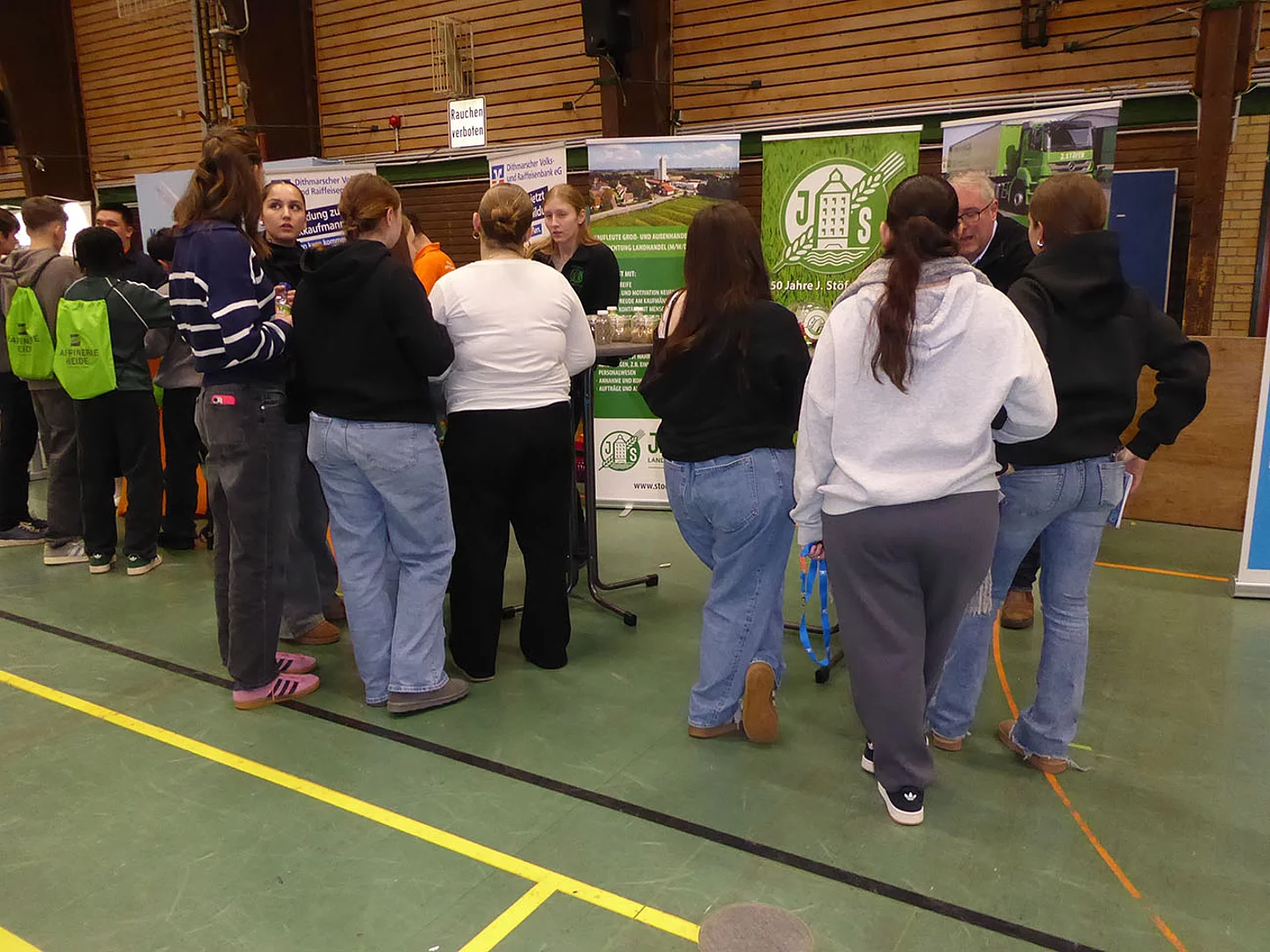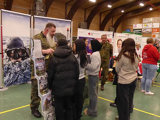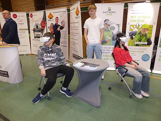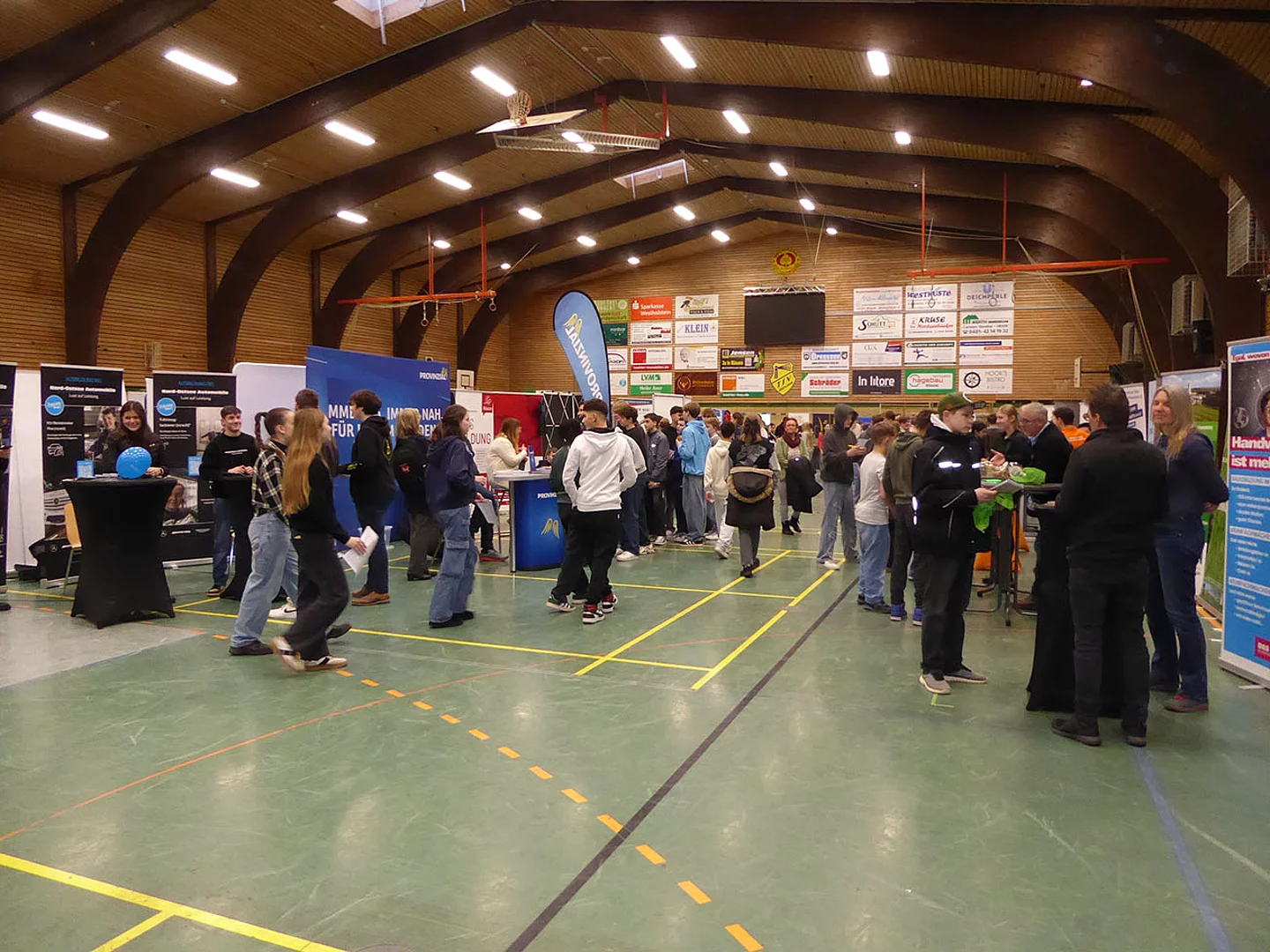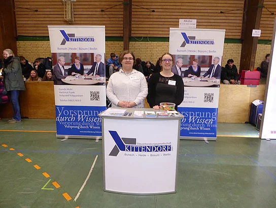 Nach Eröffnung der Berufsmesse durch Schulleiter Kurt Siemund und Bildungskoordinatorin Claudia Brandt, Organisatorin der Messe, besuchten nicht nur Schülerinnen und Schüler mit ihren Lehrkräften die Veranstaltung. Der Einladung gefolgt waren auch einige Eltern sowie der ehemalige Bürgermeister Hans-Jürgen Lütje und sein Nachfolger Oliver Kumbartzky.