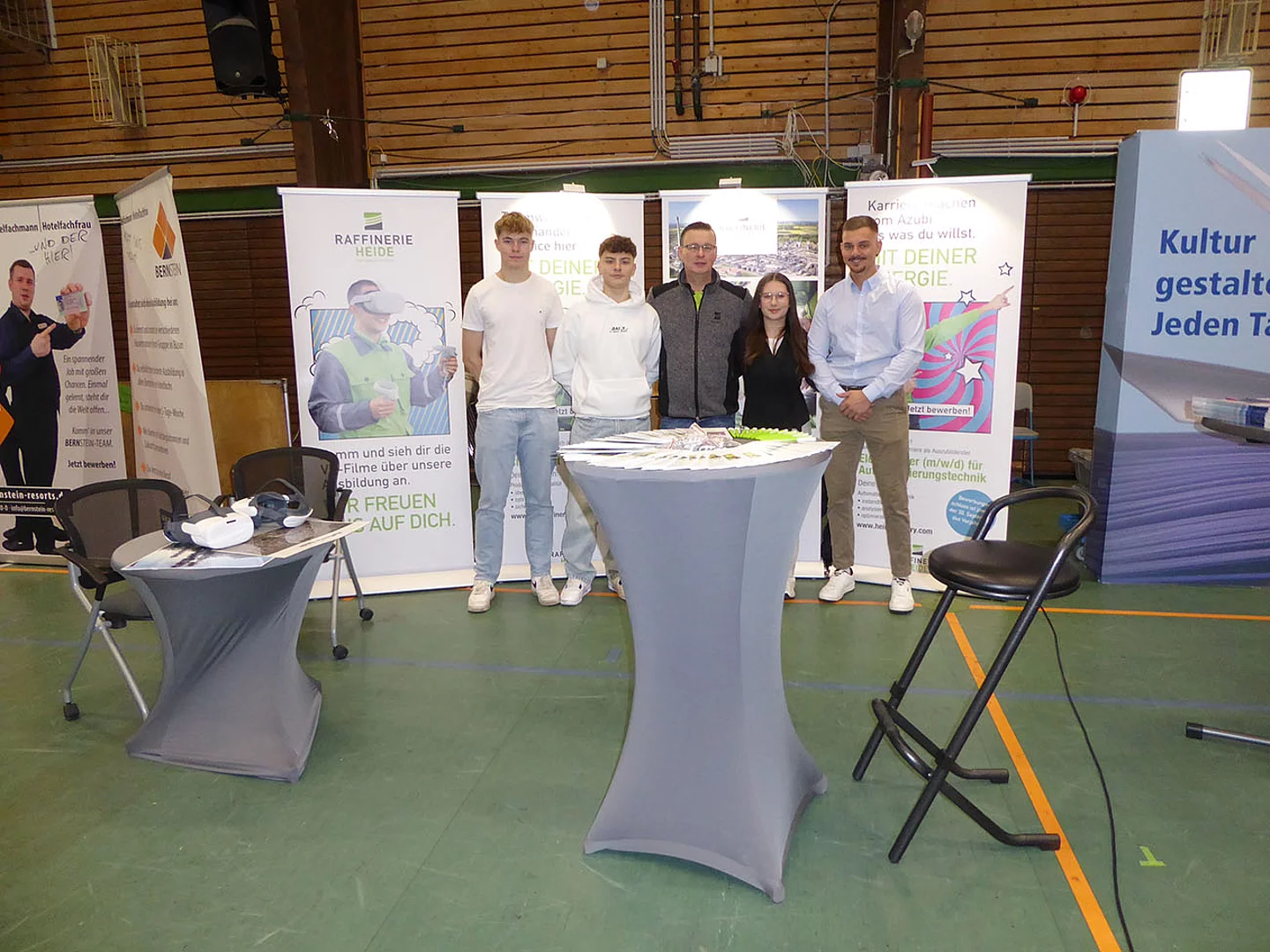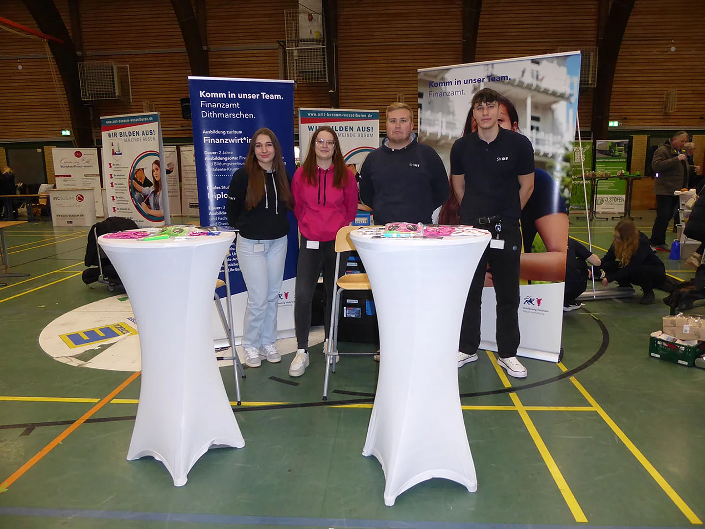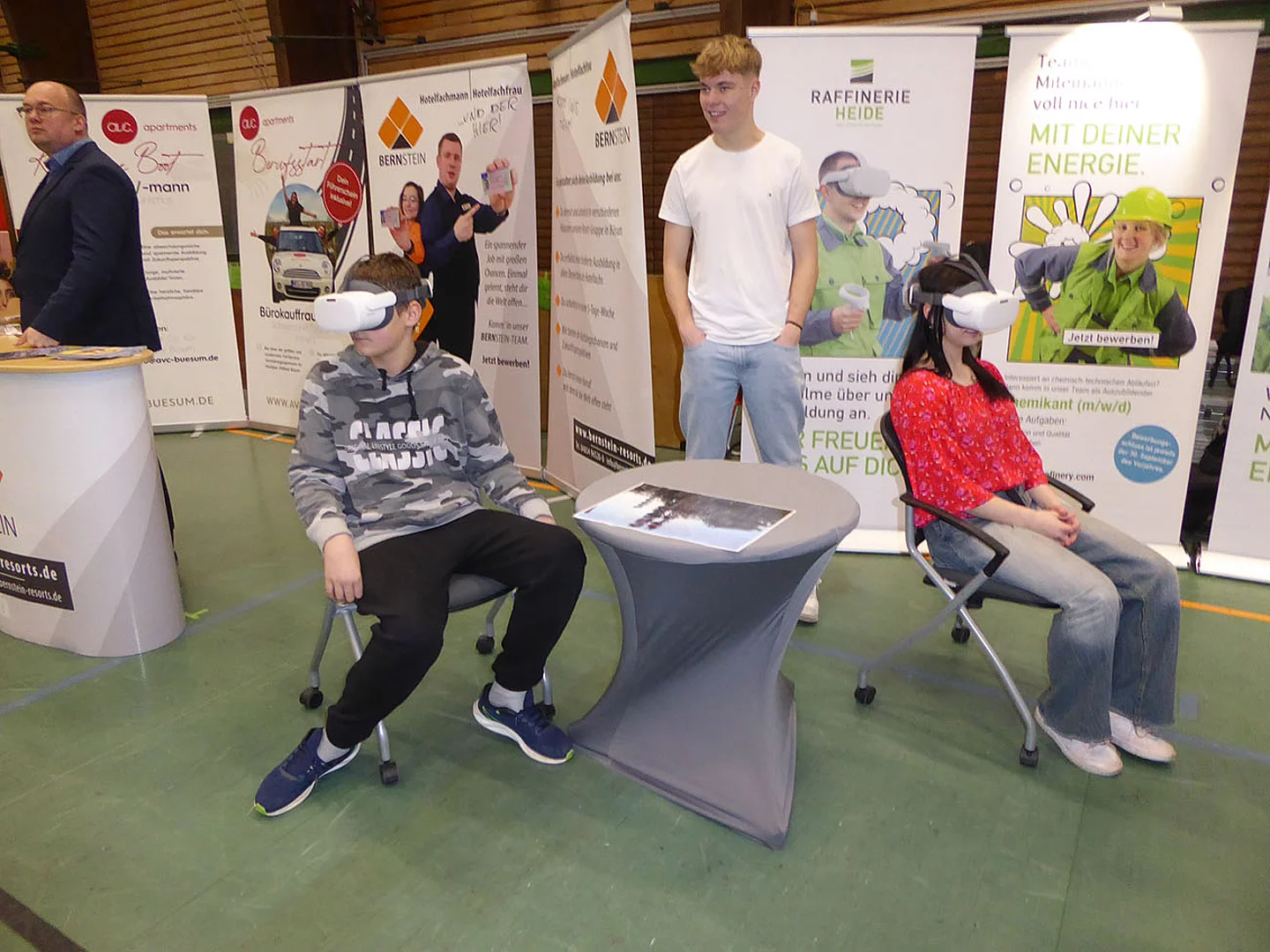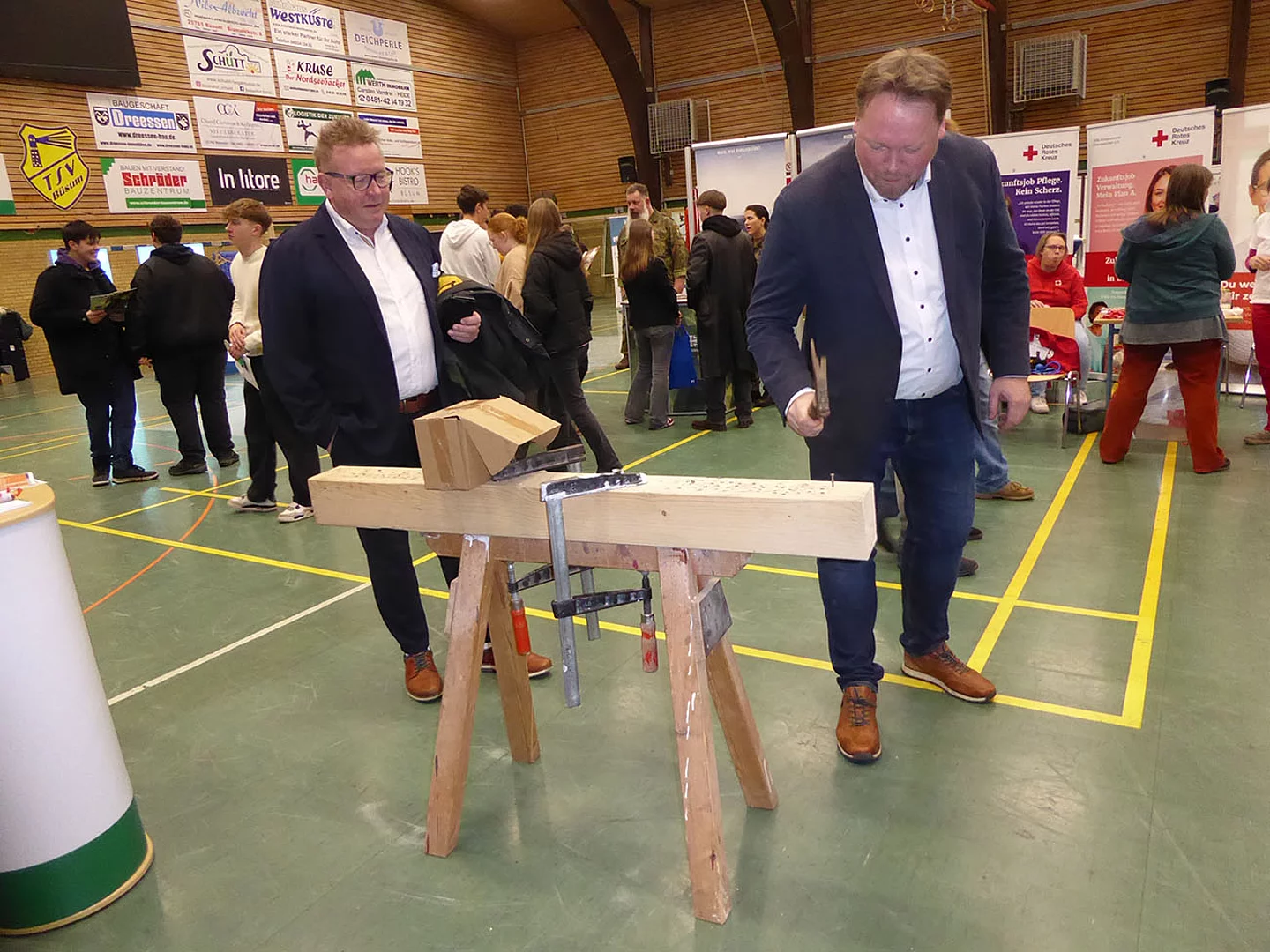 Nach Eröffnung der Berufsmesse durch Schulleiter Kurt Siemund und Bildungskoordinatorin Claudia Brandt, Organisatorin der Messe, besuchten nicht nur Schülerinnen und Schüler mit ihren Lehrkräften die Veranstaltung. Der Einladung gefolgt waren auch einige Eltern sowie der ehemalige Bürgermeister Hans-Jürgen Lütje und sein Nachfolger Oliver Kumbartzky.