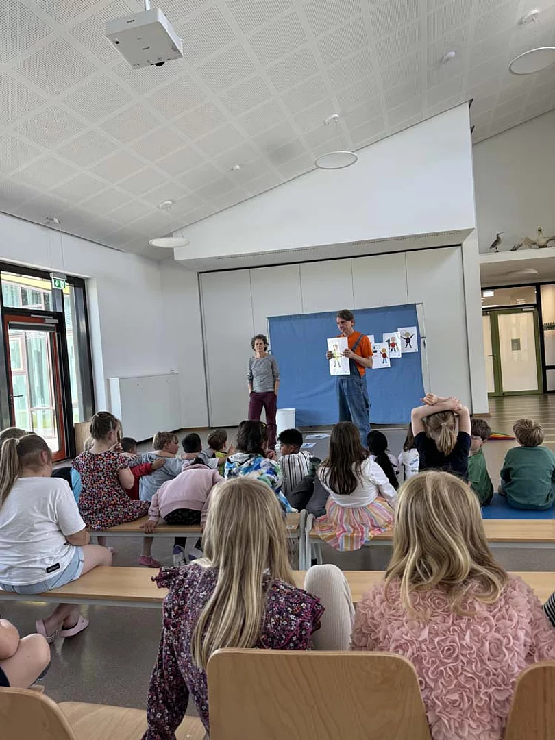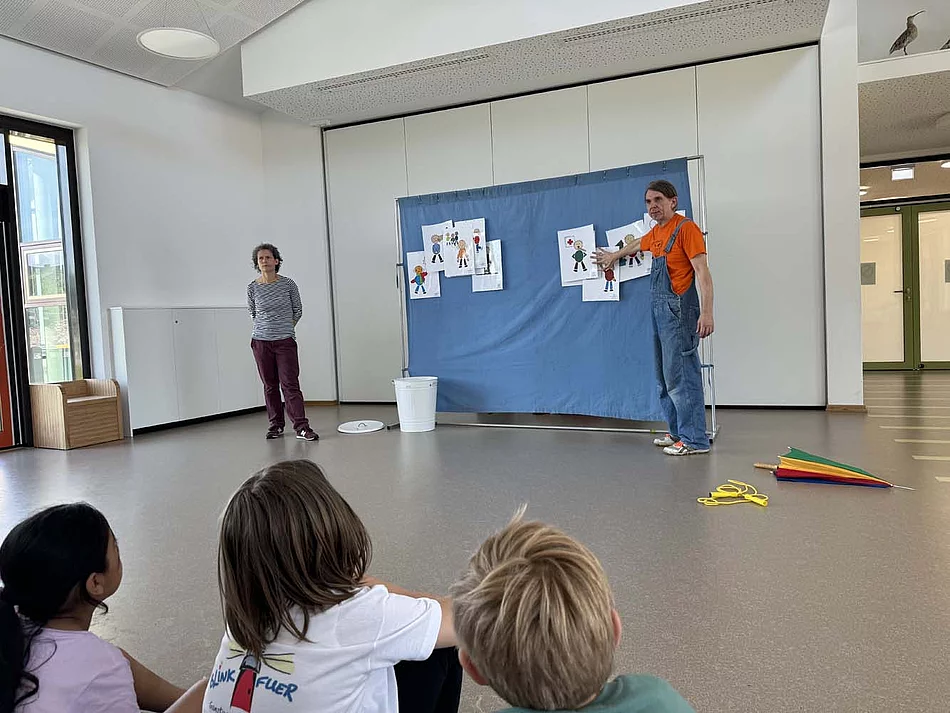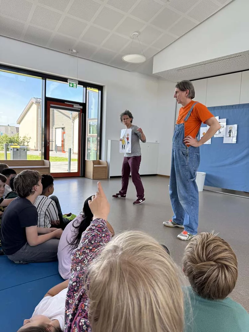 Die Schauspielerin und der Schauspieler der theaterpädagogischen Werkstatt aus Hamburg besuchten uns am Grundschulteil an zwei Tagen. Am ersten Abend waren die Eltern eingeladen, um sich das Theaterstück „Die große Nein-Tonne“ anzusehen. Anschließend übermittelte das Schauspielerpaar den Eltern ihre pädagogischen Absichten und Informationen zu diesem Präventions-Projekt.