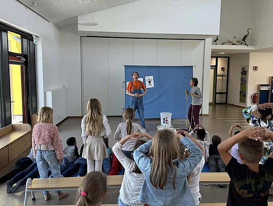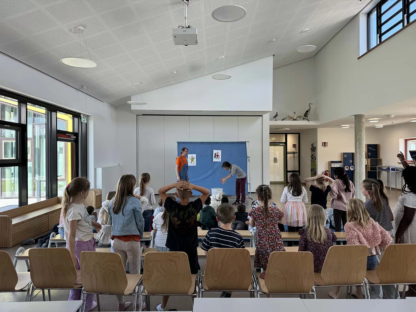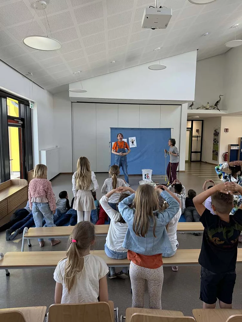 Am zweiten Tag kamen die Kinder aus den 1. und 2. Klassen sowie die Kinder der Kita Hoppetosse ebenfalls in der Aula der Grundschule zusammen und verfolgten neugierig und voller Begeisterung das Theaterstück „Die große Nein-Tonne“.
