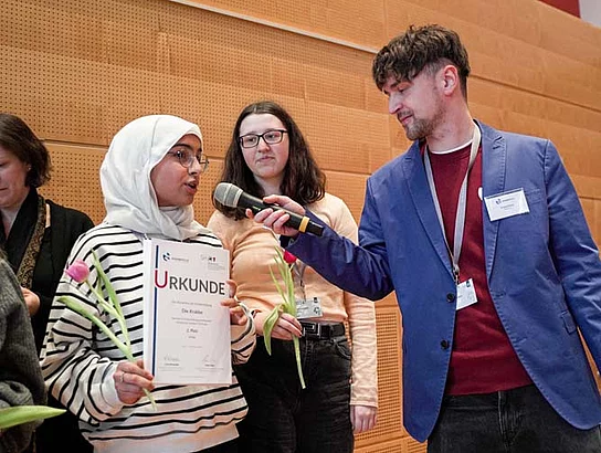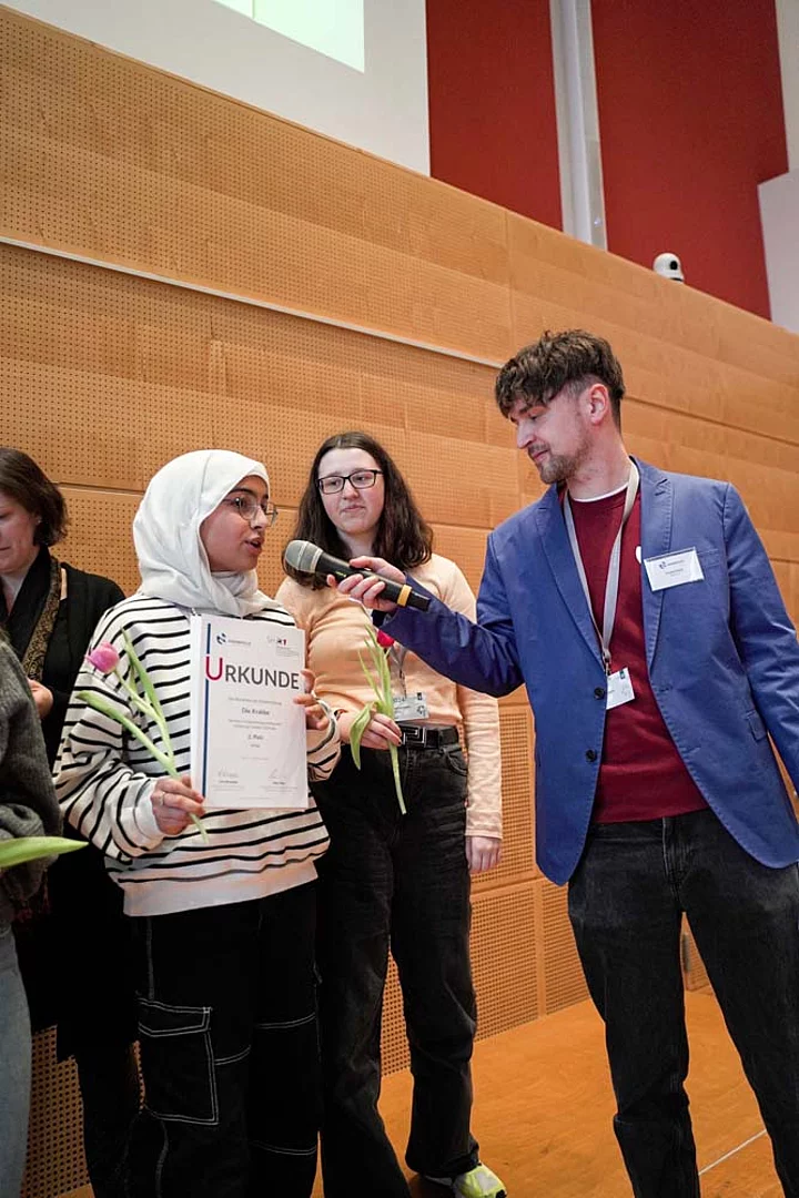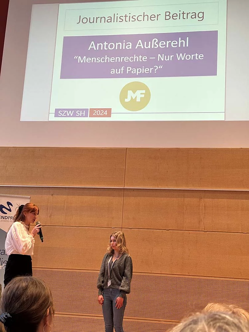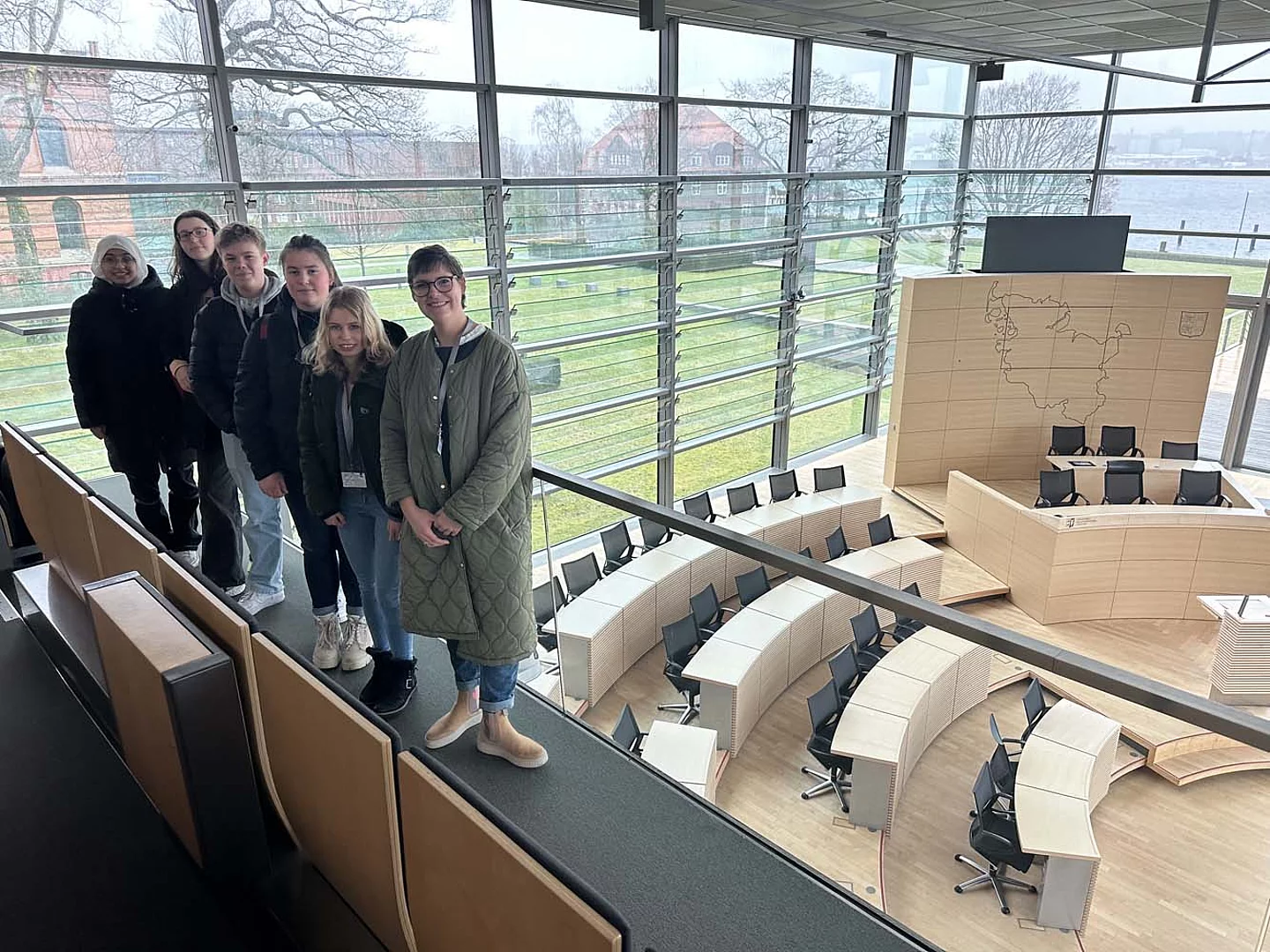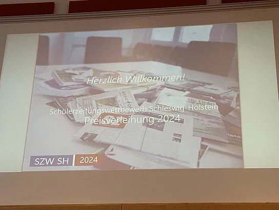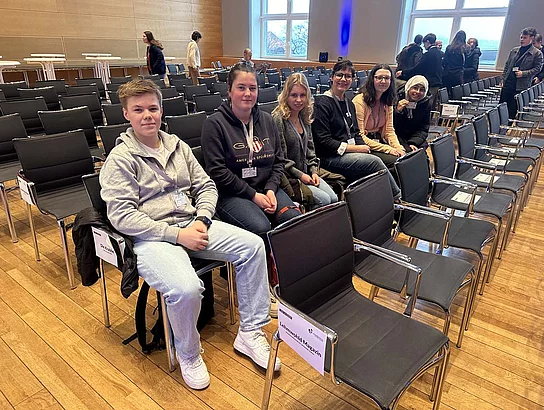 Fünf Schülerinnen und Schüler aus der Redaktion fuhren in Begleitung von Lehrerin Katharina Tiedemann und der Bildungskoordinatorin Claudia Brandt nach Kiel, wo sie gespannt auf die Verkündung der Ergebnisse warteten.