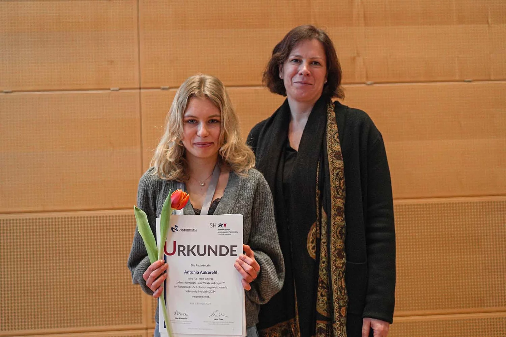 Landtagspräsidentin und Schirmherrin Kristina Herbst begrüßte die rund 100 angereisten Schülerinnen und Schüler mit ihren Begleitpersonen und nahm gemeinsam mit Projektkoordinatorin Linn Könnecke und Moderator Tristan Dück vom Team Jugendpresse die Preisverleihung vor. Als die Prämierung für die Schülerzeitungen der Kategorie Sekundarstufe II anstand, nahm das Herzklopfen noch einmal deutlich zu. Umso größer war die Freude, als verkündet wurde, dass die Büsumer es auf Platz zwei geschafft haben. Auf Platz 1 landete die Theodor-Heuss-Schule aus Pinneberg mit ihrem Magazin „Pressident_IN“. “. Doch es gab anschließend noch eine weitere Überraschung, als der beste journalistische Beitrag prämiert wurde. Diese Auszeichnung erhielt Antonia Außerehl von der SaM. Seit dem Relaunch im Jahr 2021 ist dies bereits die zweite Auszeichnung, über die sich die Redaktion freuen darf. Beim Schülerzeitungswettbewerb 2021/2022 der Provinzial Nord Brandkasse schaffte es „Die Krabbe“ sogar auf Platz 1. Erstmalig erschien die Büsumer Schülerzeitung 1956.