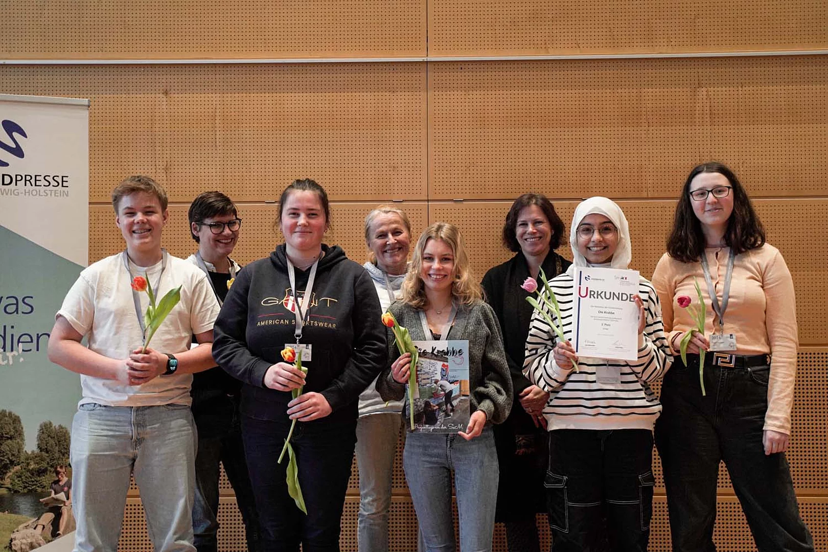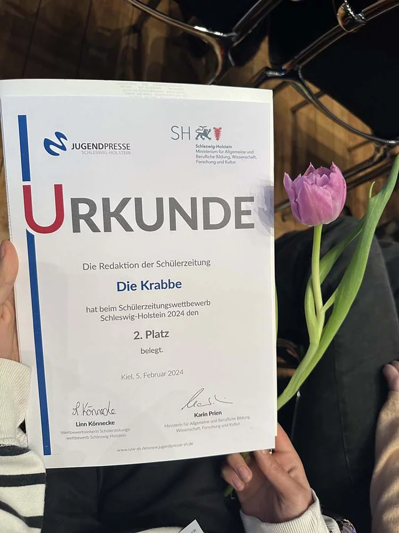 Nachdem sich die Redaktion „Die Krabbe“ der Büsumer Schule am Meer (SaM) beim Landeswettbewerb für Schleswig-Holstein beworben hatte, folgte eine Einladung zur Preisverleihung in das Kieler Landeshaus. Die Jury machte es in ihrem Einladungsschreiben spannend, so dass vorerst nicht bekannt war, welcher Platz errungen wurde.