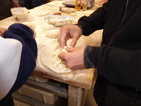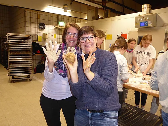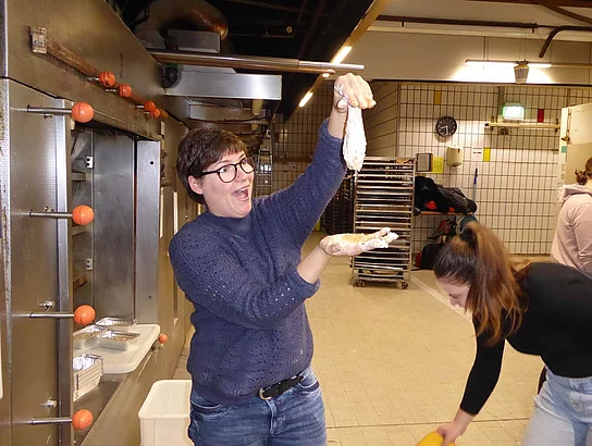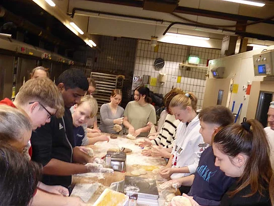 Beim Projekt „Back dich durch Europa“, geleitet von Lydia Giewat und Katharina Tiedemann, beschäftigten sich alle zunächst mit landestypischen Backwaren und den dazugehörigen Gewürzen und Zutaten. Für den Folgetag wurden diverse Lieblingszutaten eingekauft, bevor es am zweiten Tag frühmorgens in eine echte Backstube ging. Philipp Balzer, Bäckermeister und Geschäftsführer der Bäckerei „Mühlen Bäcker“ in Heide, machte für die Schule am Meer eine Ausnahme und empfing die Projektgruppe in seiner Backstube zum kreativen Backen und für eine interessante Führung. Die Schülerinnen und Schüler erfuhren viel über die unterschiedlichen Teigsorten, bevor sie gemeinsam mit dem Gesellen Florian phantasievolle Back-Kunstwerke herstellten. Mit reichlich gefüllten Körben ging es schließlich nach Büsum an die SaM zurück, um die selbstgebackenen Kreationen den Besucherinnen und Besuchern anzubieten. Die Schule am Meer dankt Philipp Balzer und seinem Team, dass die Projektgruppe in der Backstube so freundlich empfangen wurde und dort selbst backen durfte.