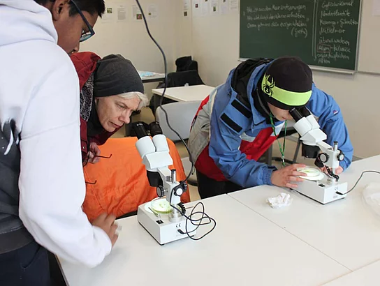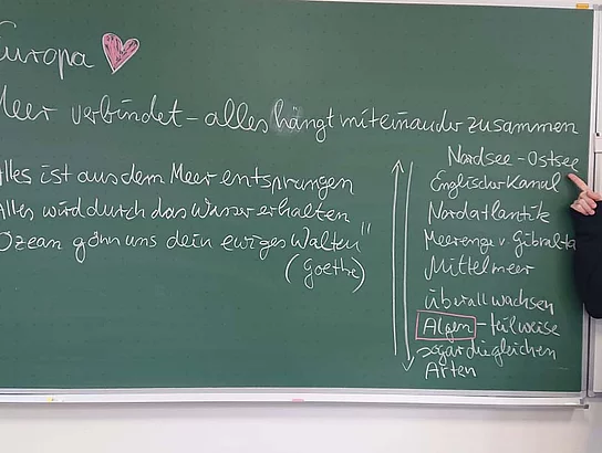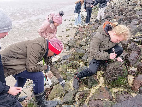 Dr. Kirstin Poremba und Dr. Katharina Keil haben das Projekt „Meer verbindet“ angeboten. Nach einer Stunde Theorie ging es ins Watt, um Algen zu sammeln, was im Januar herausfordernd ist. Die Gruppe ist fűndig geworden und konnte einige Rot-, Braun- und Grünalgen für ihre Kunstwerke sammeln. „Mit gutem Papier, Salzwasser, einer glatten Unterlage, Präpariernadel und Pinsel ging es an die Arbeit, zum Ende bei schöner französischer, spanischer und italienischer Musik. Der Kreativität waren keine Grenzen gesetzt. Das war sehr eindrucksvoll“, so Dr. Poremba. Wer sich nun fragte, was Algen aufs Papier bringen mit Europa zu tun habe, dem sagte sie: „Die Nord- und Ostsee sind eng mit dem Nordatlantik und mit dem Mittelmeer verbunden. Die Algen vor der Haustür in Bűsum findest Du ebenso an den Küsten Großbritanniens, den Niederlanden, in Belgien, Frankreich, Portugal, Spanien, Italien usw. Alles fließt und ist miteinander verbunden. Sogar die ganzen Küsten der Welt, egal wo, zeigen immer einen sehr ähnlichen Algenbewuchs.“