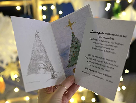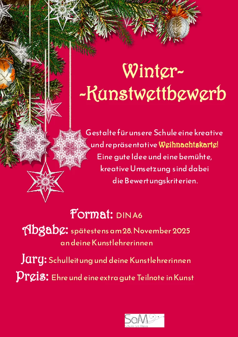 Es war eine nahezu unlösbare Aufgabe, zwischen den vielen tollen Motiven auszuwählen. Daher wurden am Ende vier Gewinner-Motive ausgewählt und auf die Weihnachtsgrußkarte der SaM gedruckt. Da jedoch alle Karten sehenswert sind, wurde in der Pausenhalle der weiterführenden Schule eine Vielzahl der eingesendeten Karten ausgestellt. Viel Freude beim Betrachten! Wir freuen uns auf den Weihnachtskarten-Wettbewerb im nächsten Jahr, mit hoffentlich erneut so vielen, tollen Kunstwerken!