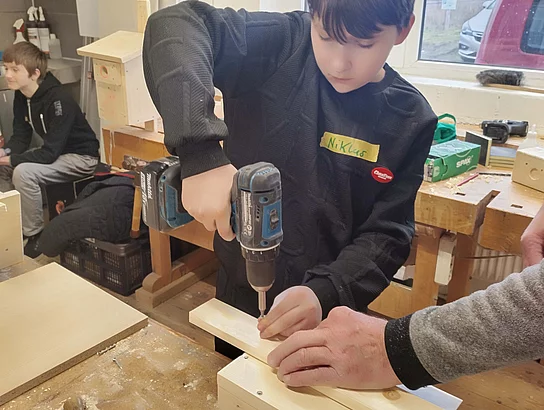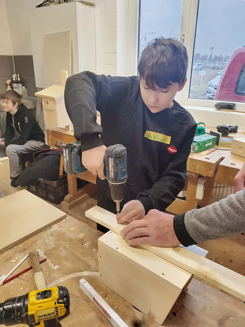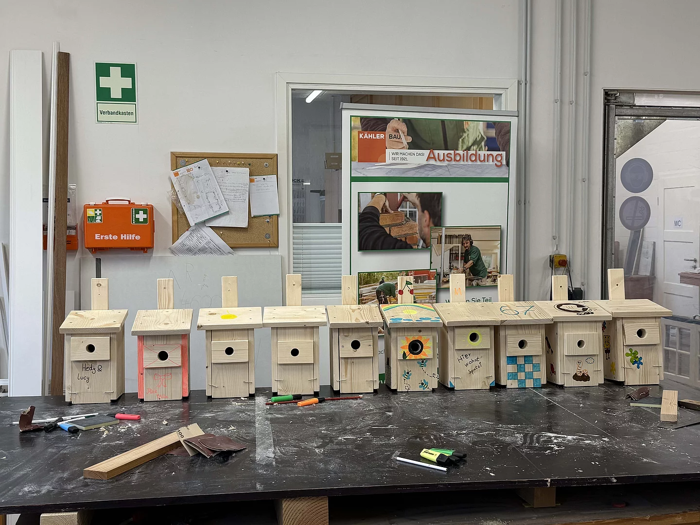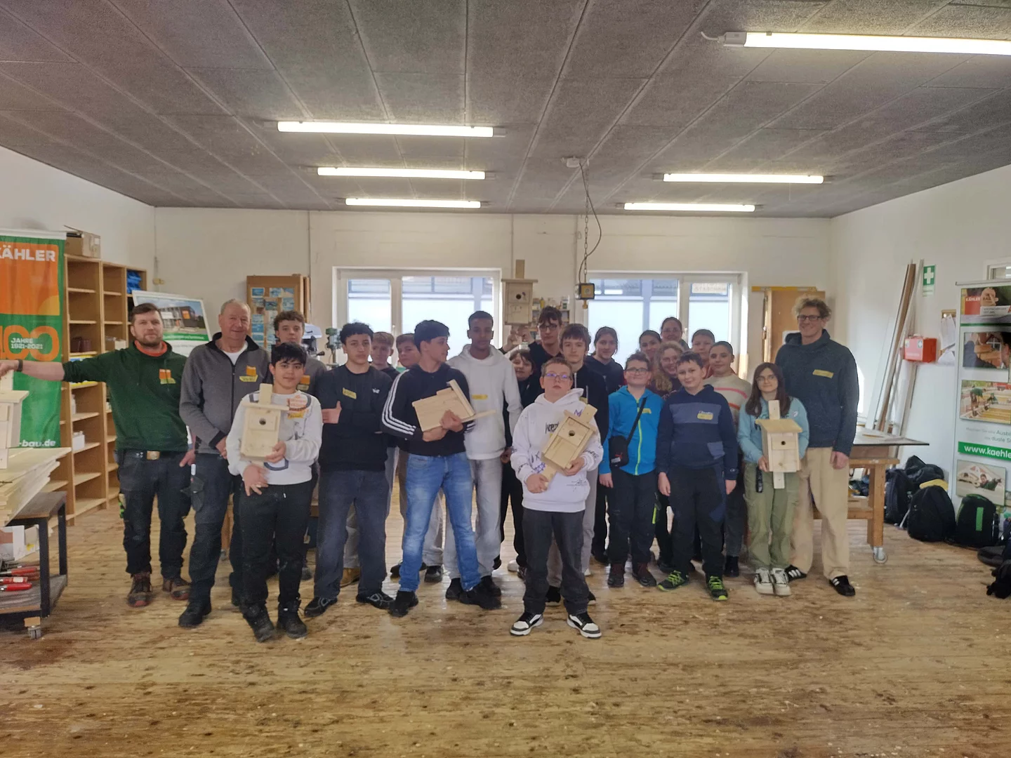 Den Anfang machten die siebten Klassen. An drei Tagen besuchten die Schülerinnen und Schüler klassenweise in Begleitung einer Lehrkraft die Tischlerei. Gemeinsam mit den Profis von Kähler Bau durften sie Vogelhäuser bauen. Nach Bauanleitung führten sie bis auf das Sägen alle Arbeitsschritte selbstständig durch. Dabei wurde schnell deutlich, wer zuhause schon viel mit Hammer und Akkuschrauber zu tun hatte. Falk Miron, Leiter der Orientierungsstufe, begleitete die 7b. „Der Projekttag war super vorbereitet und die Mitarbeiterinnen und Mitarbeiter von Kähler Bau waren sehr freundlich und haben unsere Schülerinnen und Schüler ganz individuell unterstützt“, sagte er. Tatsächlich waren am Ende des besonderen Schultages die Vogelhäuschen fertiggestellt.