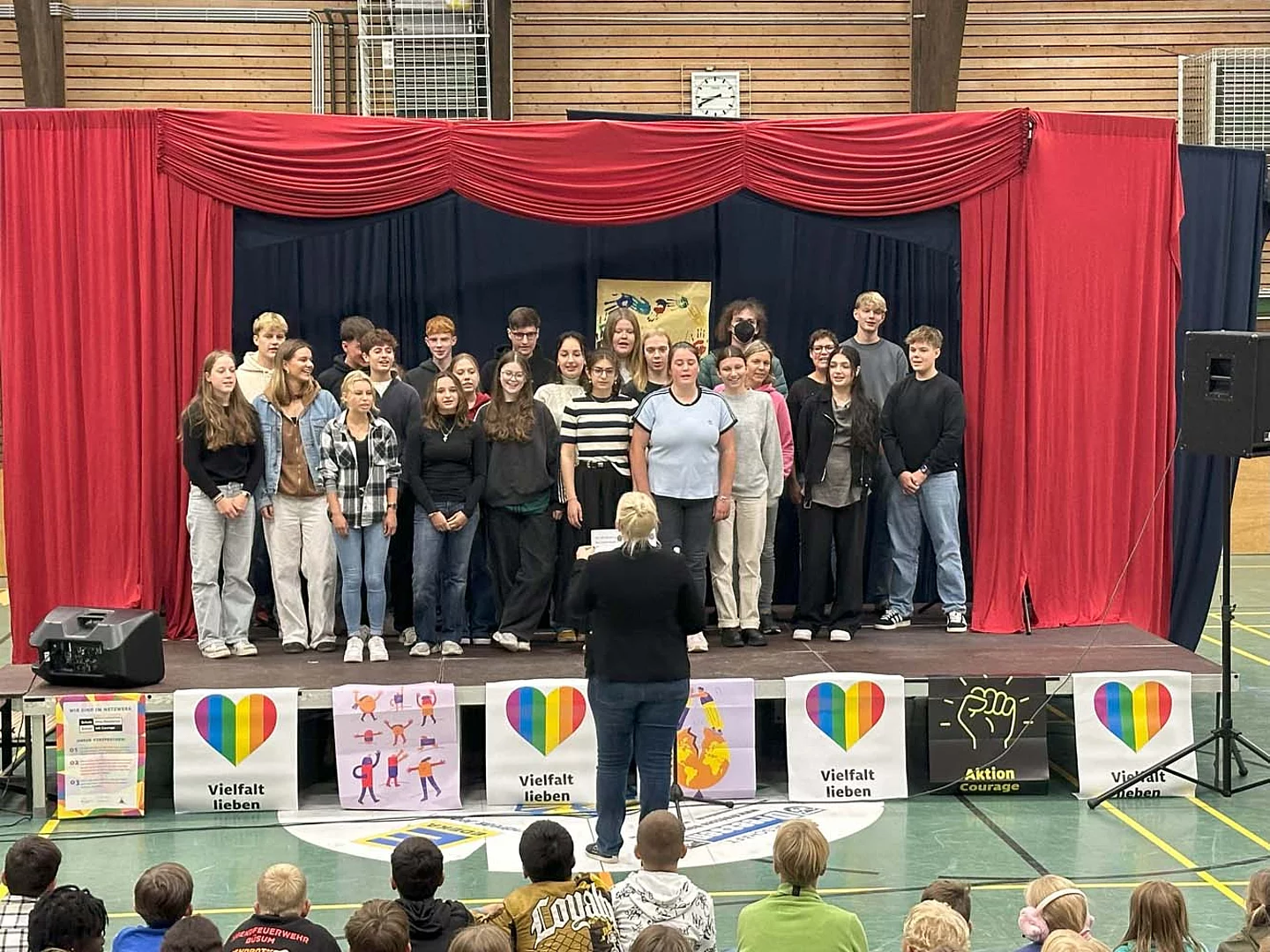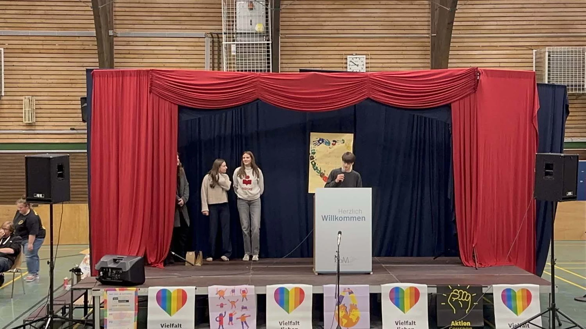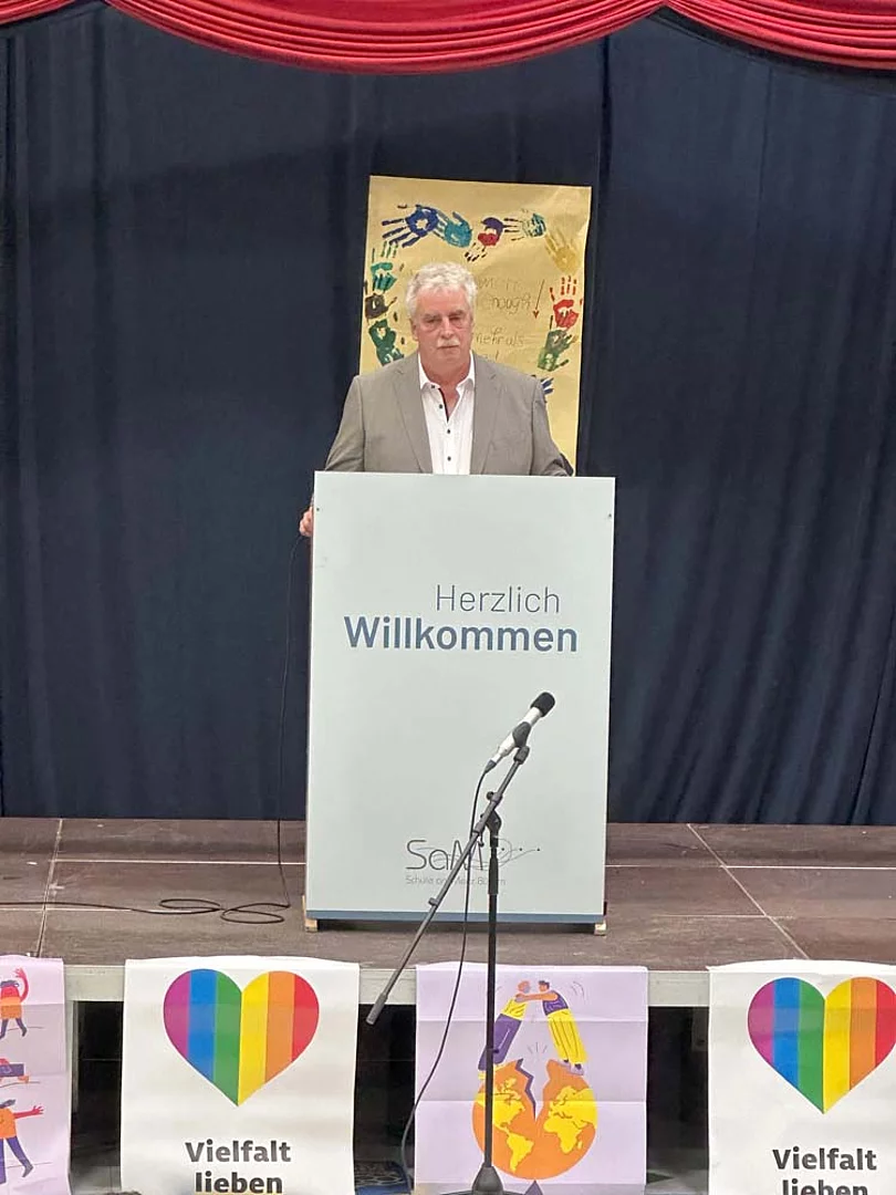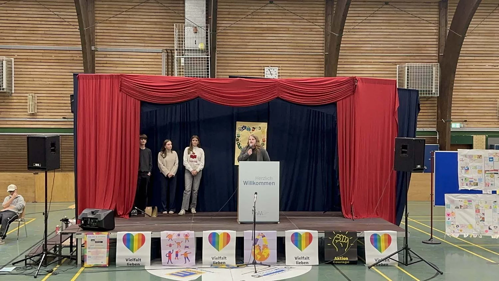 Begeisterung löste die Rede von unserem Paten Lorenz Kähler aus. Er hat unter anderem mitreißend und ganz ehrlich über seine Schulzeit und Jugend erzählt. Überzeugend vermittelte er, dass wir uns gemeinsam dafür einsetzen, dass weder Rassismus noch Diskriminierung an unserer Schule einen Platz haben.