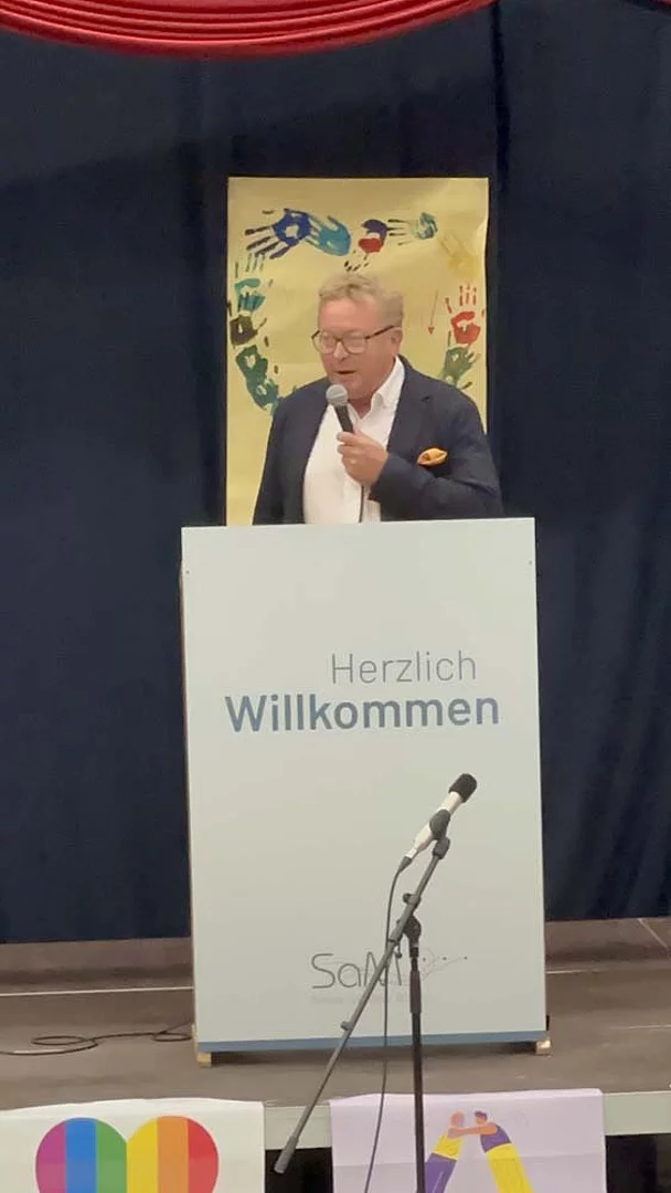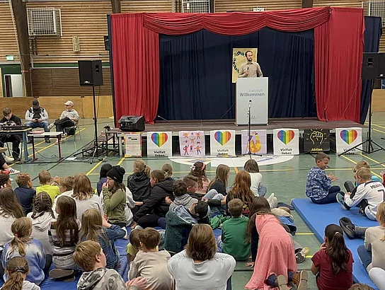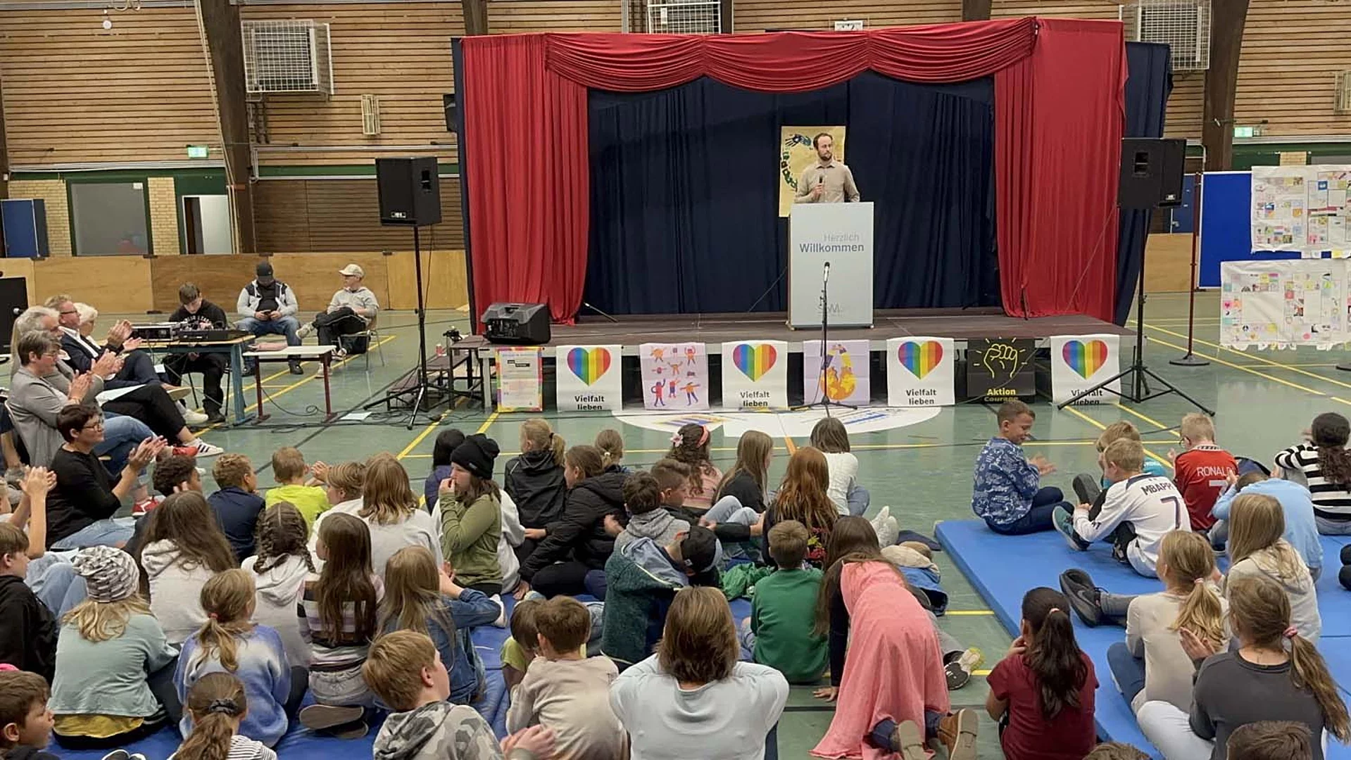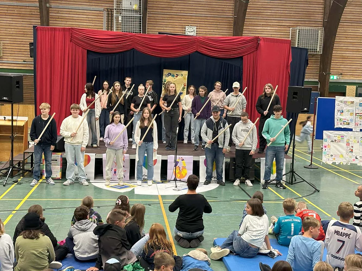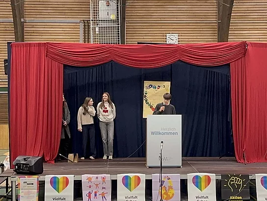 Begeisterung löste die Rede von unserem Paten Lorenz Kähler aus. Er hat unter anderem mitreißend und ganz ehrlich über seine Schulzeit und Jugend erzählt. Überzeugend vermittelte er, dass wir uns gemeinsam dafür einsetzen, dass weder Rassismus noch Diskriminierung an unserer Schule einen Platz haben.