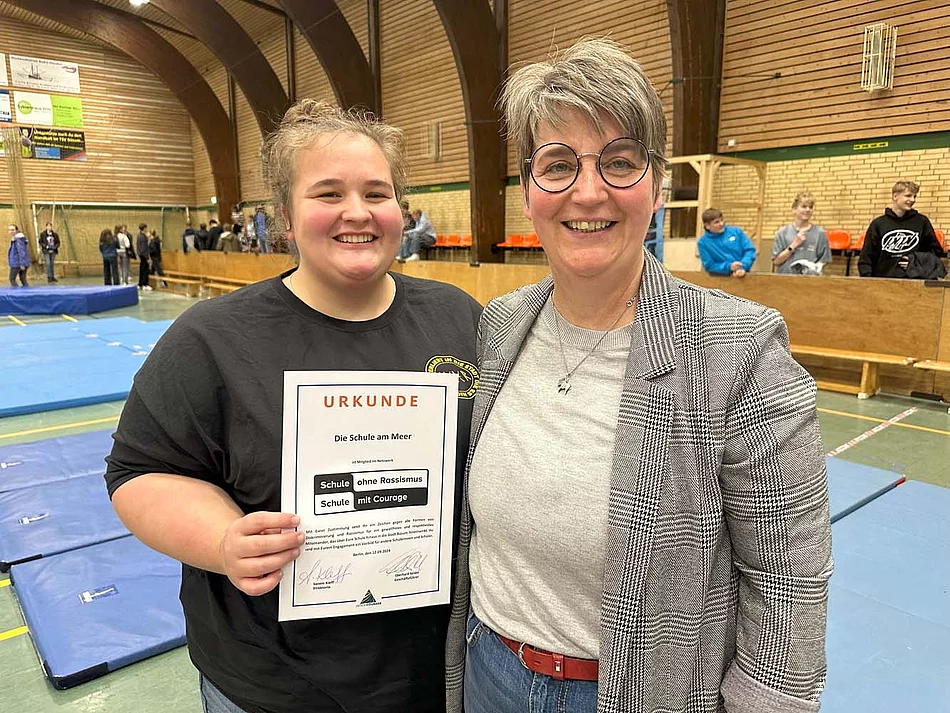 Die musikalischen und darstellenden Beiträge sowie die Reden der Schülerinnen und Schüler verdeutlichten, wie sehr sich die SaM für ein faires Miteinander einsetzt. Die feierliche Übergabe der Urkunde von Karla Müller-Helfrich, Regionalkoordinatorin des Netzwerks Schule ohne Rassismus- Schule mit Courage, ist ein weiterer Antrieb für einen aufmerksamen, fairen und noch toleranteren Alltag.