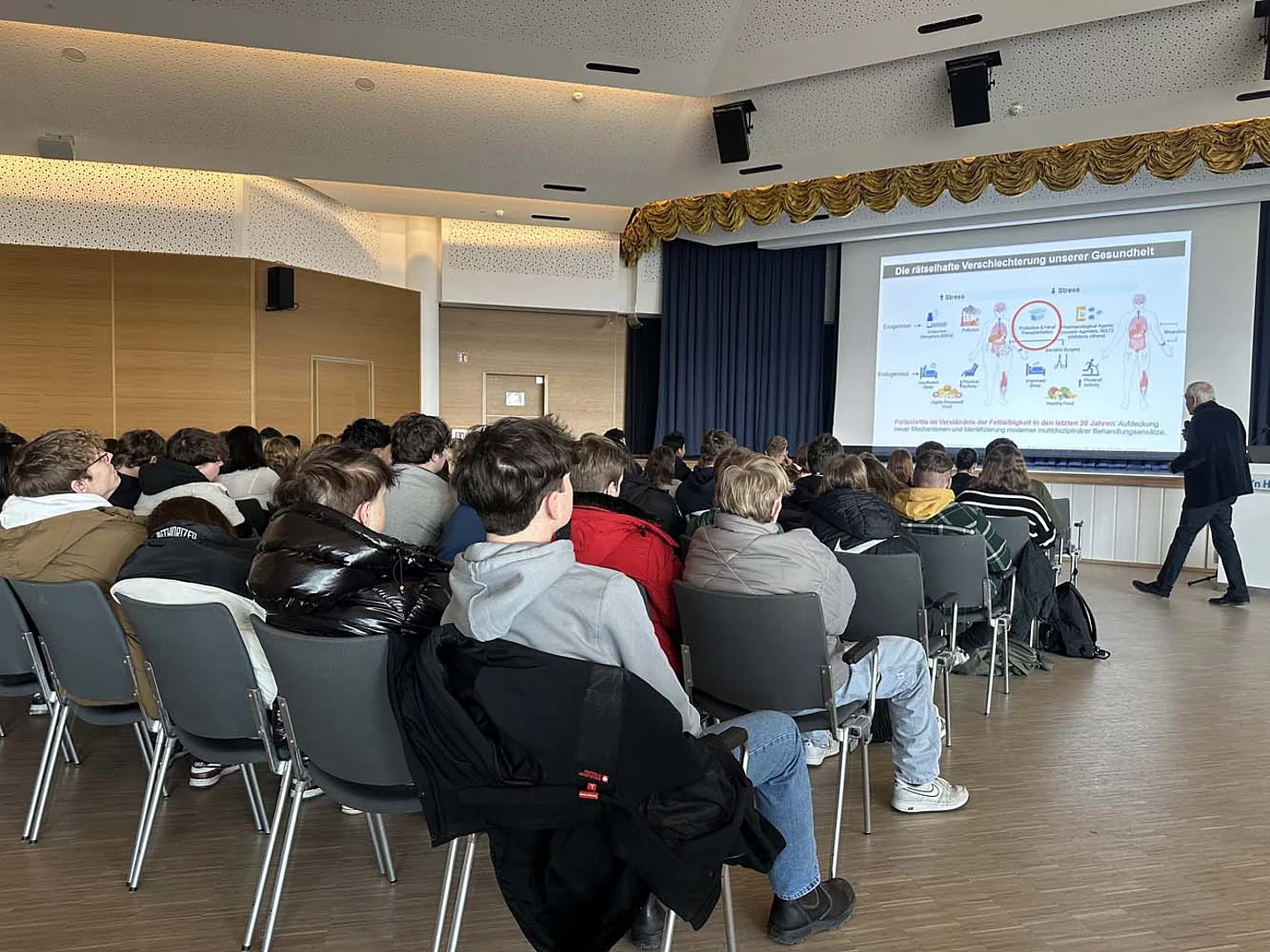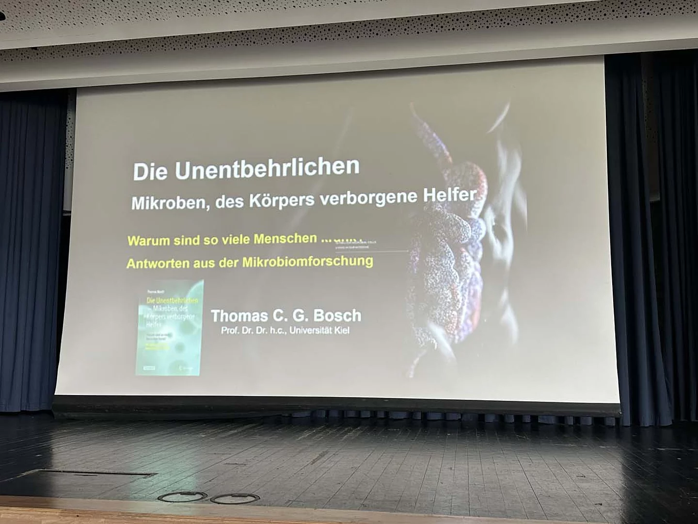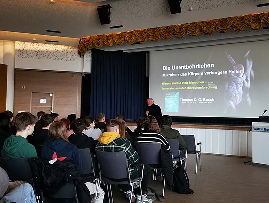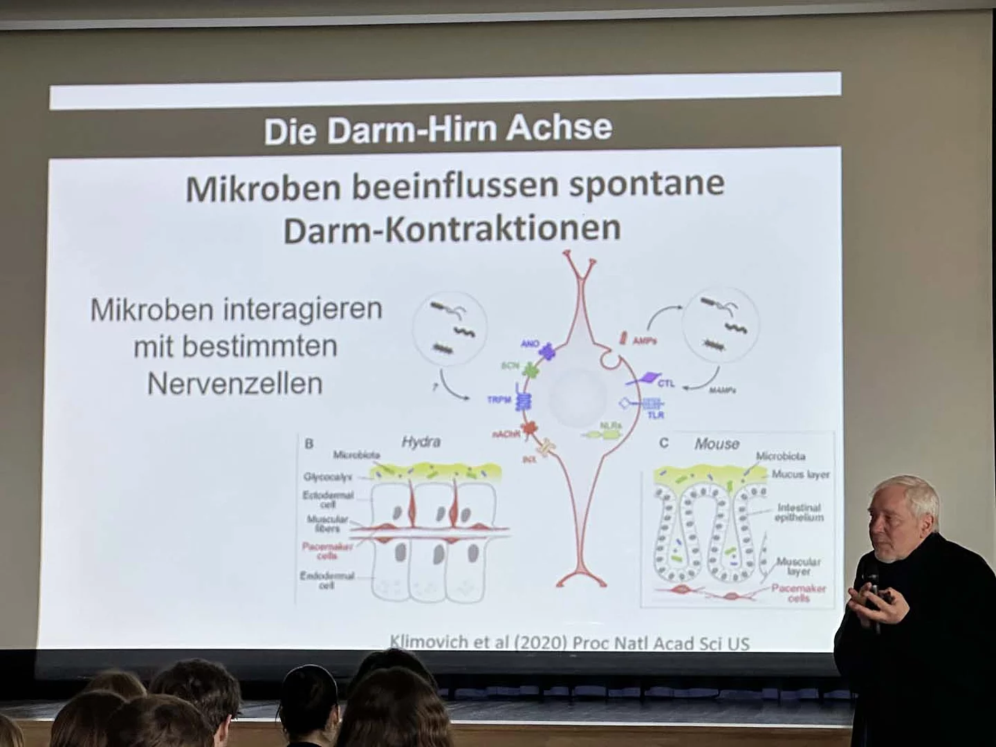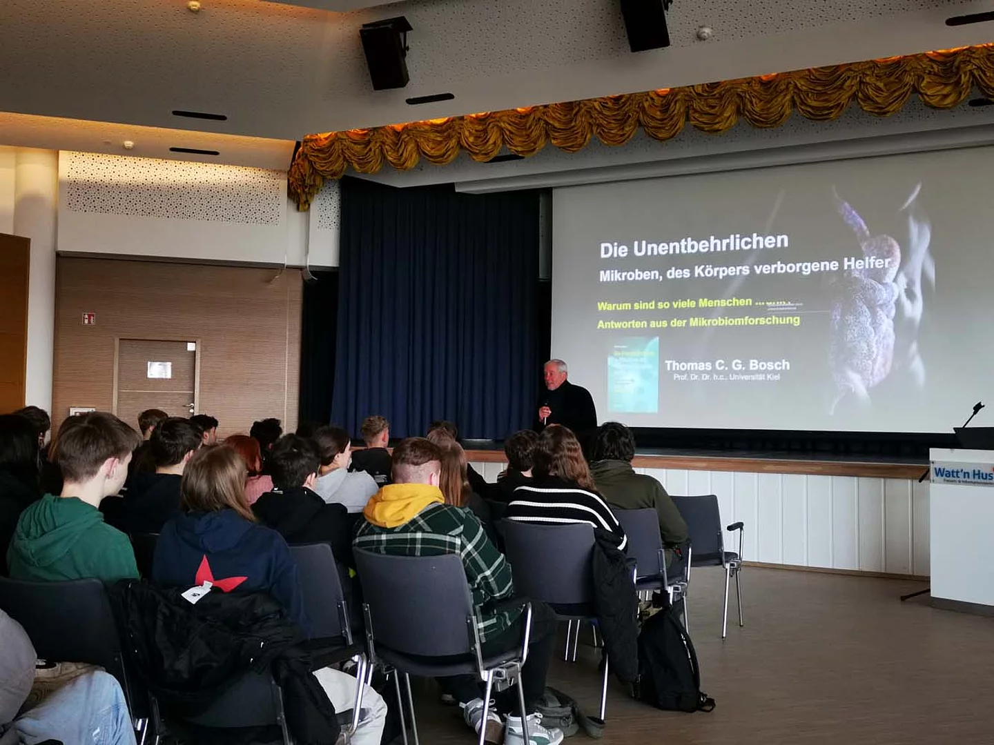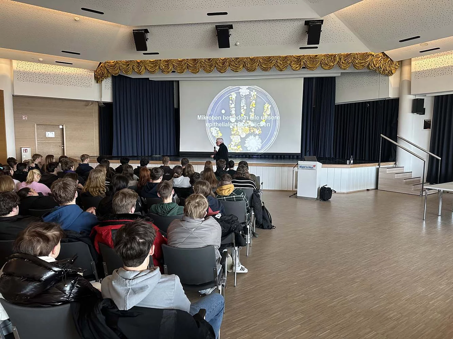 Den Vortrag „Die Unentbehrlichen: Mikroben, des Körpers verborgene Helfer“ von Professor Bosch besuchten Frau Heinrich, Frau Dr. Keil und Frau Dr. Poremba gemeinsam mit den Schülerinnen und Schülern der Jahrgänge 10 bis Q1 am 07.03.24. In diesem Vortrag ging es um die Rolle der Mikroben in unserem Körper und die Zusammenhänge mit der zunehmenden Verschlechterung unserer Gesundheit. Dabei gab es u. a. um interessante Einblicke in die aktuelle Mikrobiomforschung, die Bedeutung der Darm-Hirn Achse und den Nutzen von Stuhltransplantationen bei einigen schweren Erkrankungen, zum Beispiel Multiple Sklerose und Reizdarmsyndrom. „In der Natur gibt es kein keimfreies Tier, keine keimfreie Pflanze, keinen keimfreien Menschen“, so Professor Bosch. Und er fügte hinzu: „Gesund und resilient sind wir, wenn wir viele sind“.