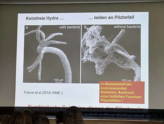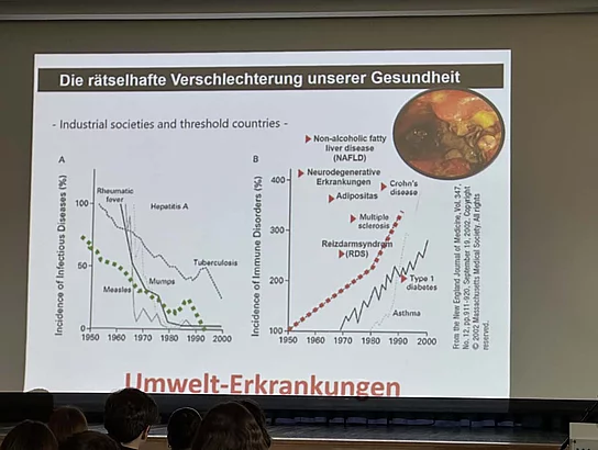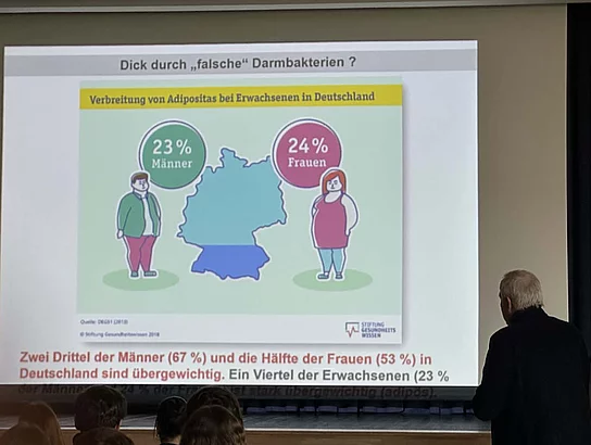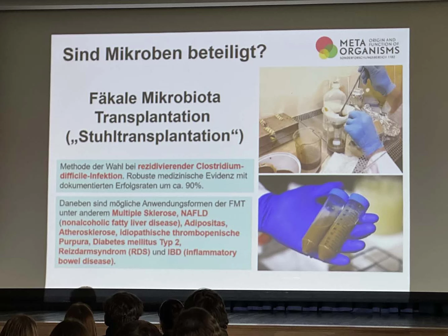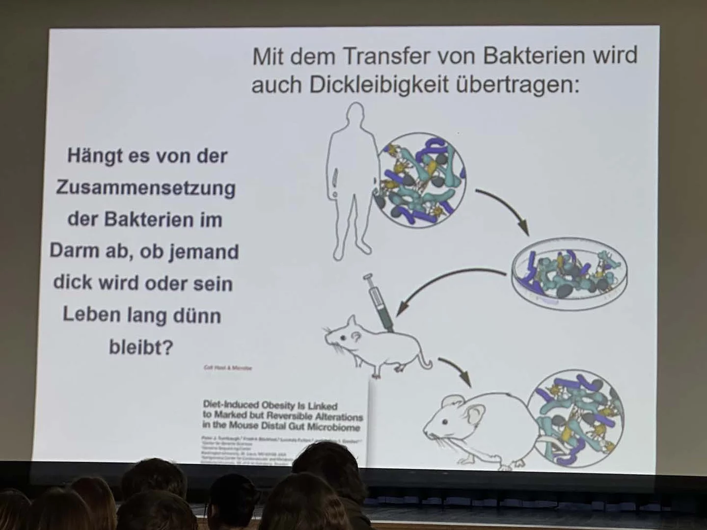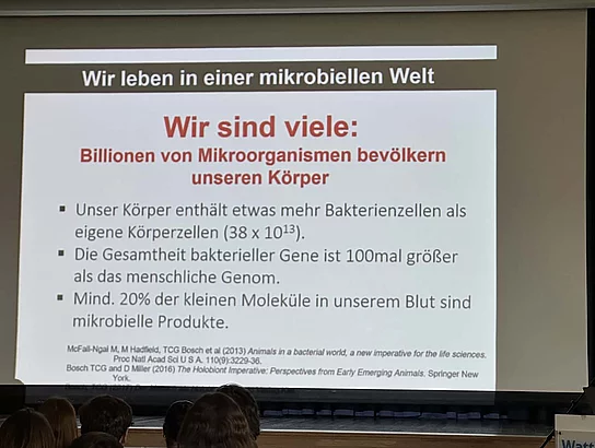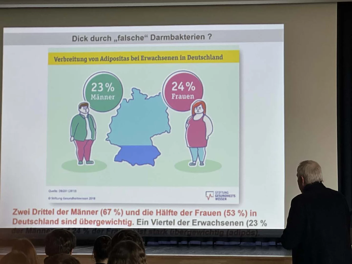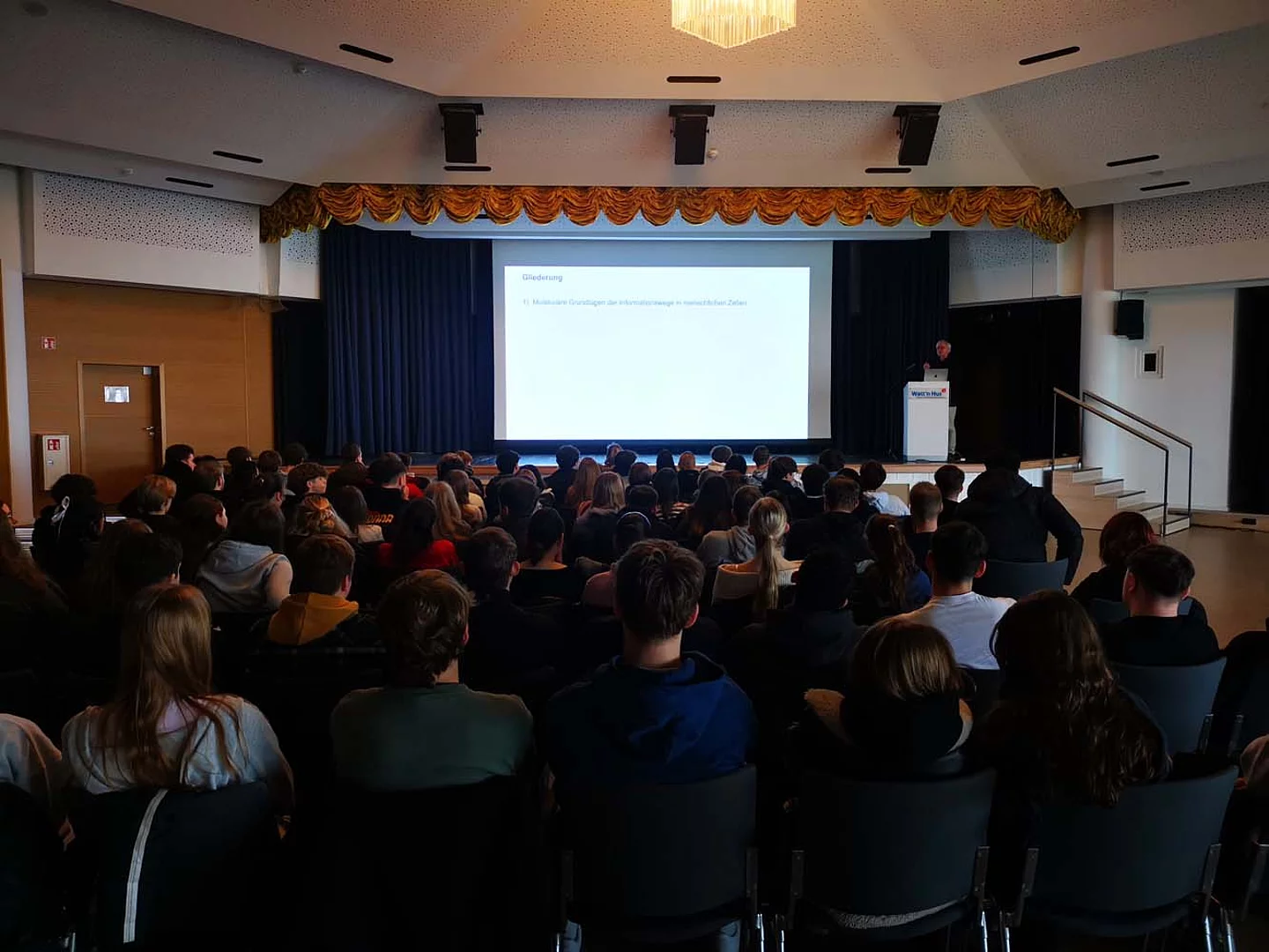 Den Vortrag „Die Unentbehrlichen: Mikroben, des Körpers verborgene Helfer“ von Professor Bosch besuchten Frau Heinrich, Frau Dr. Keil und Frau Dr. Poremba gemeinsam mit den Schülerinnen und Schülern der Jahrgänge 10 bis Q1 am 07.03.24. In diesem Vortrag ging es um die Rolle der Mikroben in unserem Körper und die Zusammenhänge mit der zunehmenden Verschlechterung unserer Gesundheit. Dabei gab es u. a. um interessante Einblicke in die aktuelle Mikrobiomforschung, die Bedeutung der Darm-Hirn Achse und den Nutzen von Stuhltransplantationen bei einigen schweren Erkrankungen, zum Beispiel Multiple Sklerose und Reizdarmsyndrom. „In der Natur gibt es kein keimfreies Tier, keine keimfreie Pflanze, keinen keimfreien Menschen“, so Professor Bosch. Und er fügte hinzu: „Gesund und resilient sind wir, wenn wir viele sind“.