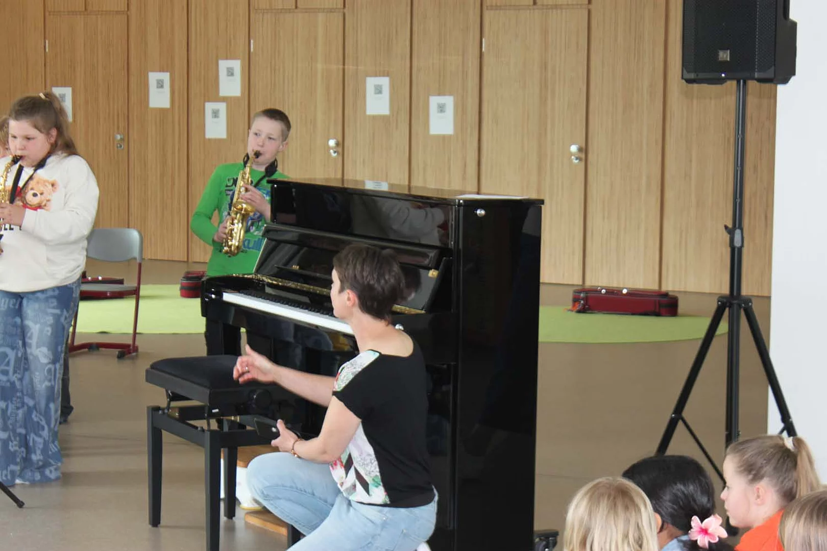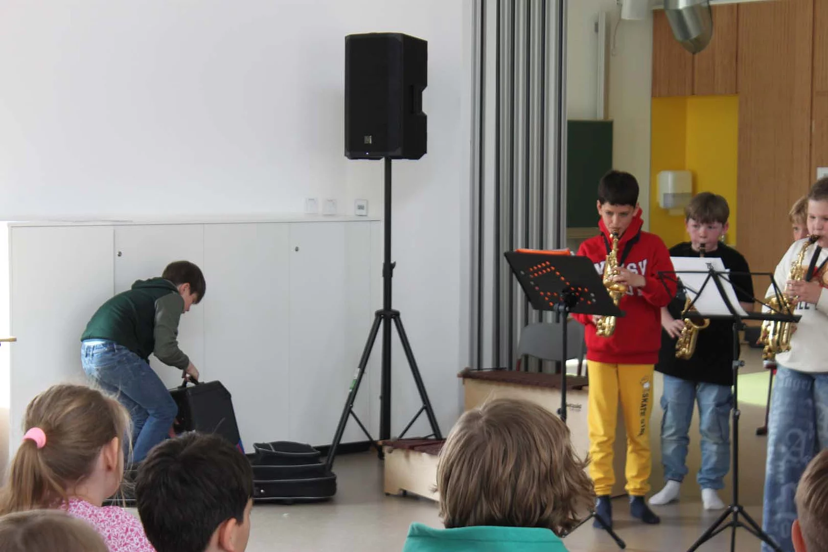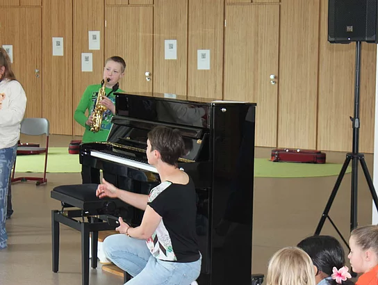 Am 29. April stellten die Drittklässler ihr musikalisches Können in der Aula des Grundschulteils unter Beweis. Sie zeigten vor einem kleinen Publikum, was sie bereits in den Musik-Projekten „Instrumentenkarussell“ und „JeKi – Jedem Kind ein Instrument“ gelernt haben. Unterstützt wurden sie dabei von einigen Viertklässlern, die schon sehr routiniert ein Instrument spielten bzw. sangen.