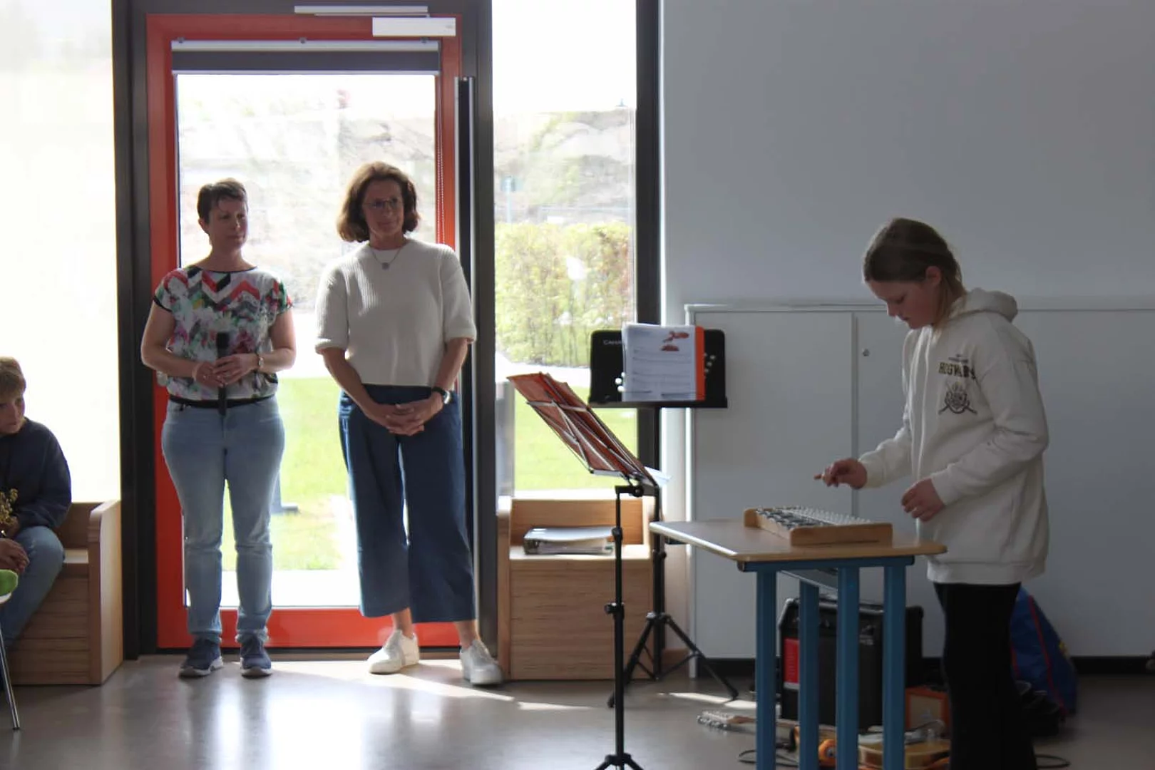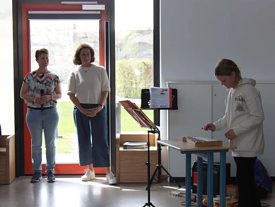 Andrea Vanselow, Leiterin des Grundschulteils, und Musiklehrerin Anneka Kapoun führten durch das Programm und lobten die Kinder, die auch zuhause fleißig mit den Leihinstrumenten geübt haben. Sie motivierten die Kinder, weiter am Ball zu bleiben, damit sie auf dem nächsten Konzert im Sommer mit noch mehr Fertigkeiten am gewählten Instrument glänzen können. Ein großes Ziel wäre es, dass wie bei ein kleinem Orchester alle Instrumente gleichzeitig auf der Bühne stehen und Stücke spielen.