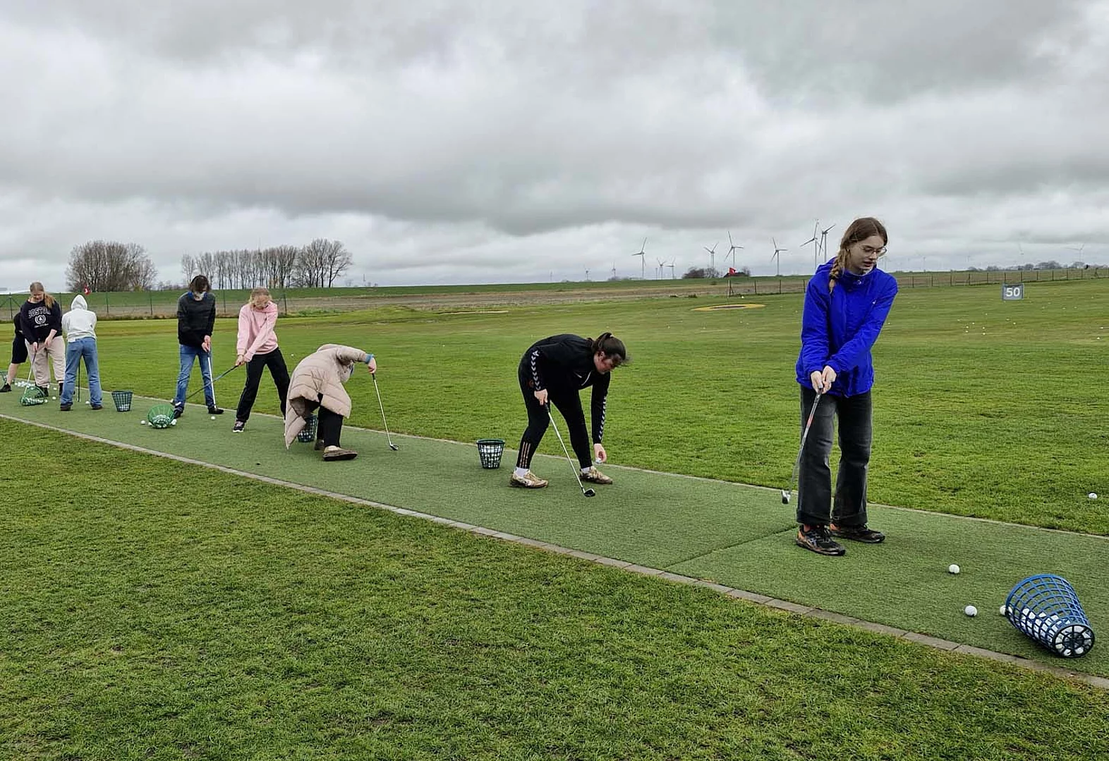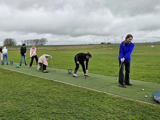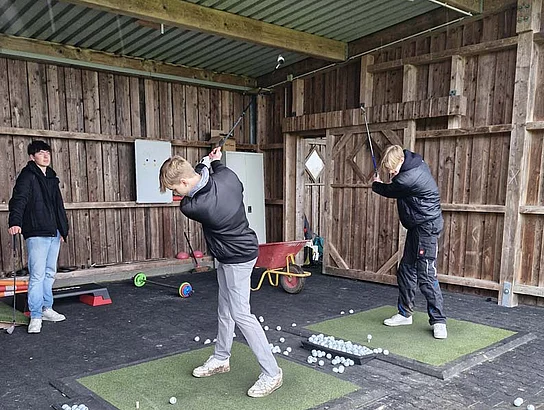 Herr Marten Brandt hat die vom Golfclubmanager Ralph Münchow und den Greenkeepern ausgesuchten Flächen für die Klasse sehr gut vorbereitet. Nach zwei Stunden Säen ging es vom wunderschönen Golfgelände auf die Driving-Ranch, wo Tim Weigl (Golflehrer und Golfprofi), auf uns wartete. Zuerst lernten wir die wichtigsten Golf-Basics kennen und Tim demonstrierte die Abschlagtechnik so eindrucksvoll, dass einige Münder vor Staunen gar nicht mehr sich schließen wollten (Abschläge von über 250m mit dem Driver-Schläger). Gleich im Anschluss ging es an die Praxis, denn "Let me do it and I understand".