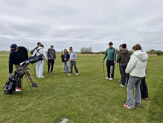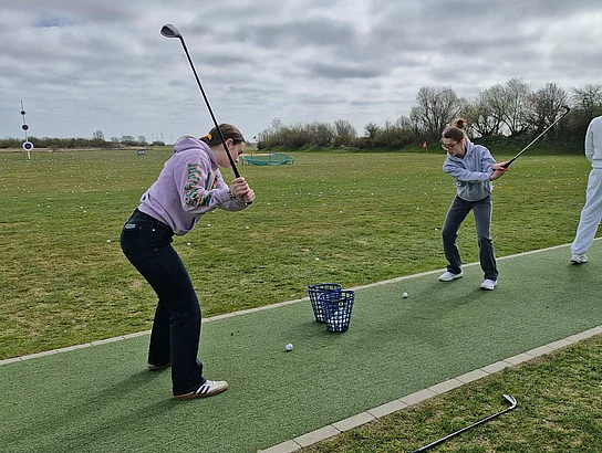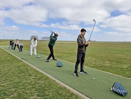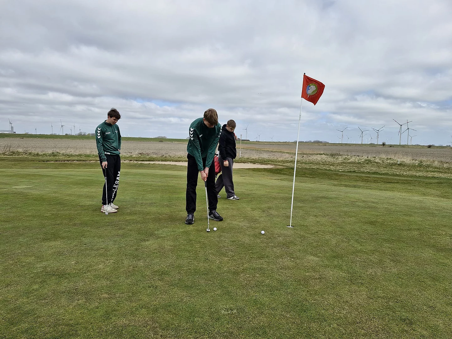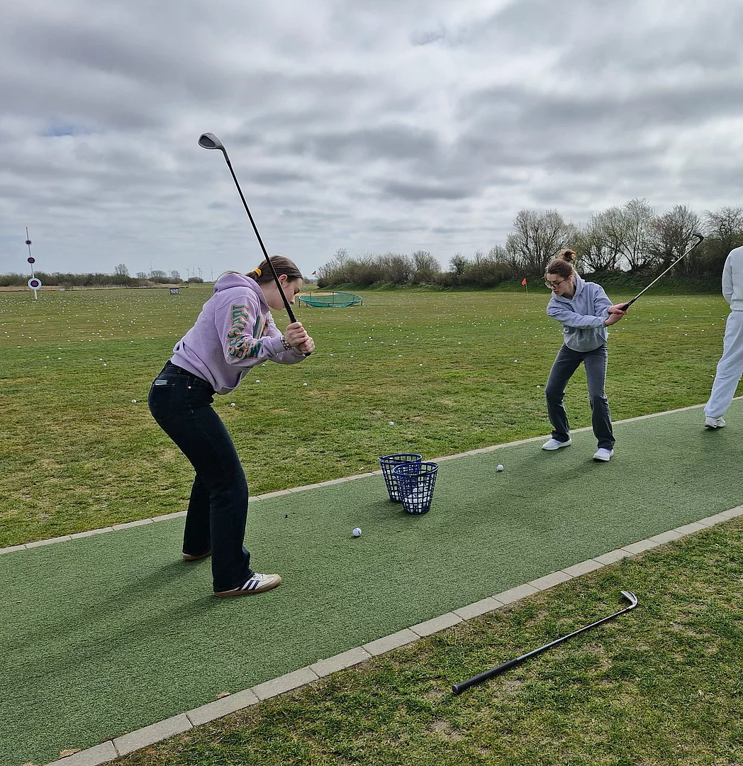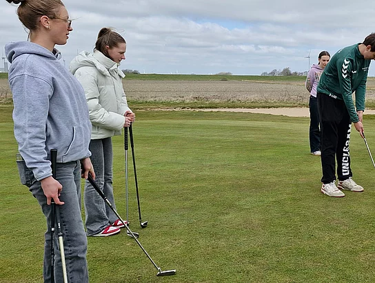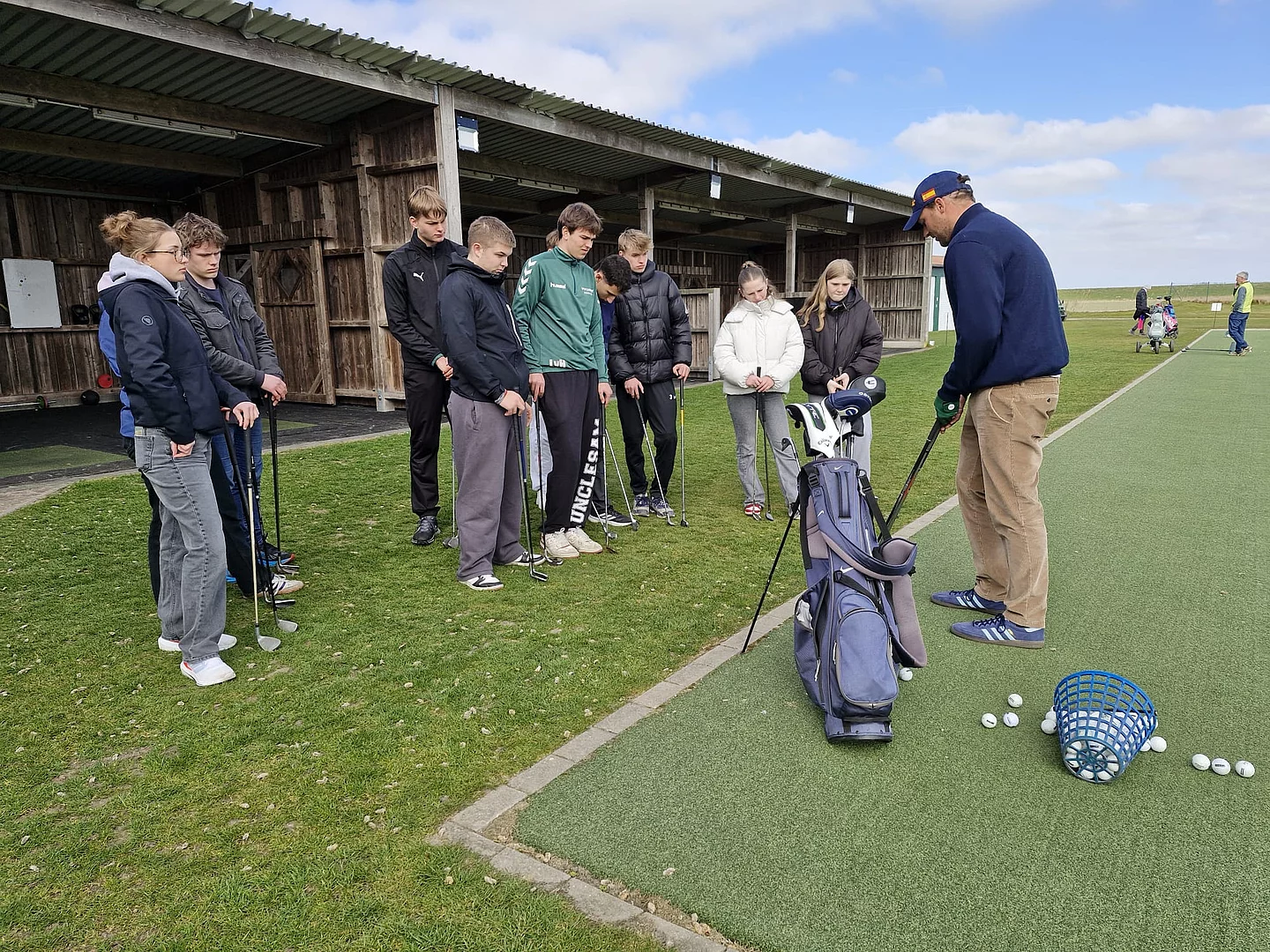 Nach einer Frühstückspause auf der Terrasse des Golfclubs in Warwerort, ging es zur Driving-Ranch, wo unser Golfehrer Tim Weigel uns allen persönlich mit Handschlag begrüßte. Eindrucksvoll erklärte er uns mit drei verschiedenen Golf-Schlägern den Abschlag. Mit dem Golfschläger „Driver“ hat Tim den Golfball 200m weit geschlagen. Luca und Elias haben ein neues Talent bei sich entdeckt und kamen als Anfänger auf Abschläge bis zu 100m! "Ja, das war ein toller Ausflug, mal was Neues mit ganz anderen Erfahrungen und abwechslungsreich", meinten Luca, Elias und Linus. Tim lobte uns, da wir so viele Bälle brauchten und dies ein Zeichen ist, dass wir oft treffen. Das ist nicht selbstverständlich bei Anfängern. "Durch die individuellen Tipps von Tim, haben wir schnell Lernerfolge erzielt und durften zum Schluss in Teams auf dem Golfplatzgelände spielen, das war klasse", meinte Anni. Das können wir gerne wieder machen.