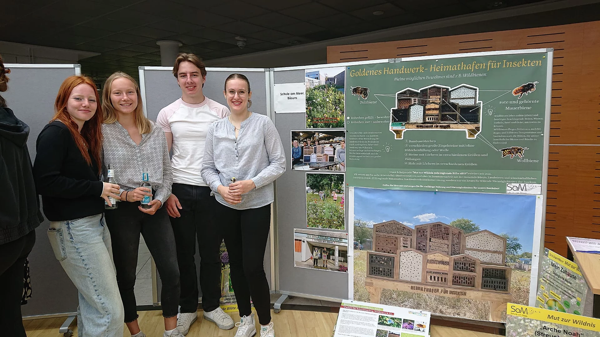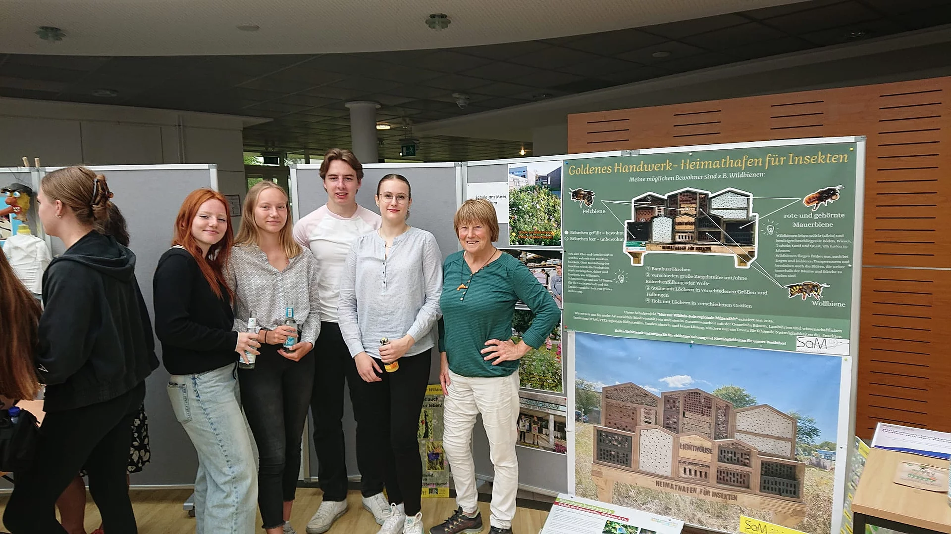Auch in diesem Jahr hat Biologielehrerin Dr. Kirstin Poremba mit ihren Schülerinnen und Schülern am Wettbewerb „Umweltpreis“ teilgenommen. In Gruppe 3 (ab Jahrgangsstufe 10) schafften sie es auf Platz 1 und dürfen sich über 800 Euro Preisgeld freuen. Beworben hatte sich die SaM mit den Blühwiesen im Rahmen des Projekts „Mut zur Wildnis – Jede Blüte zählt“, welches immer mehr ausgebaut wird, sowie mit den drei Insektenhotels in Form des Büsumer Lighthouse Hotels, die in einer Kooperation mit Kähler Bau und den Heimathafen Hotels von Schülerinnen und Schülern erbaut wurden. Insgesamt 15 Dithmarscher Schulen wurden in diesem Jahr mit dem Umweltpreis ausgezeichnet.