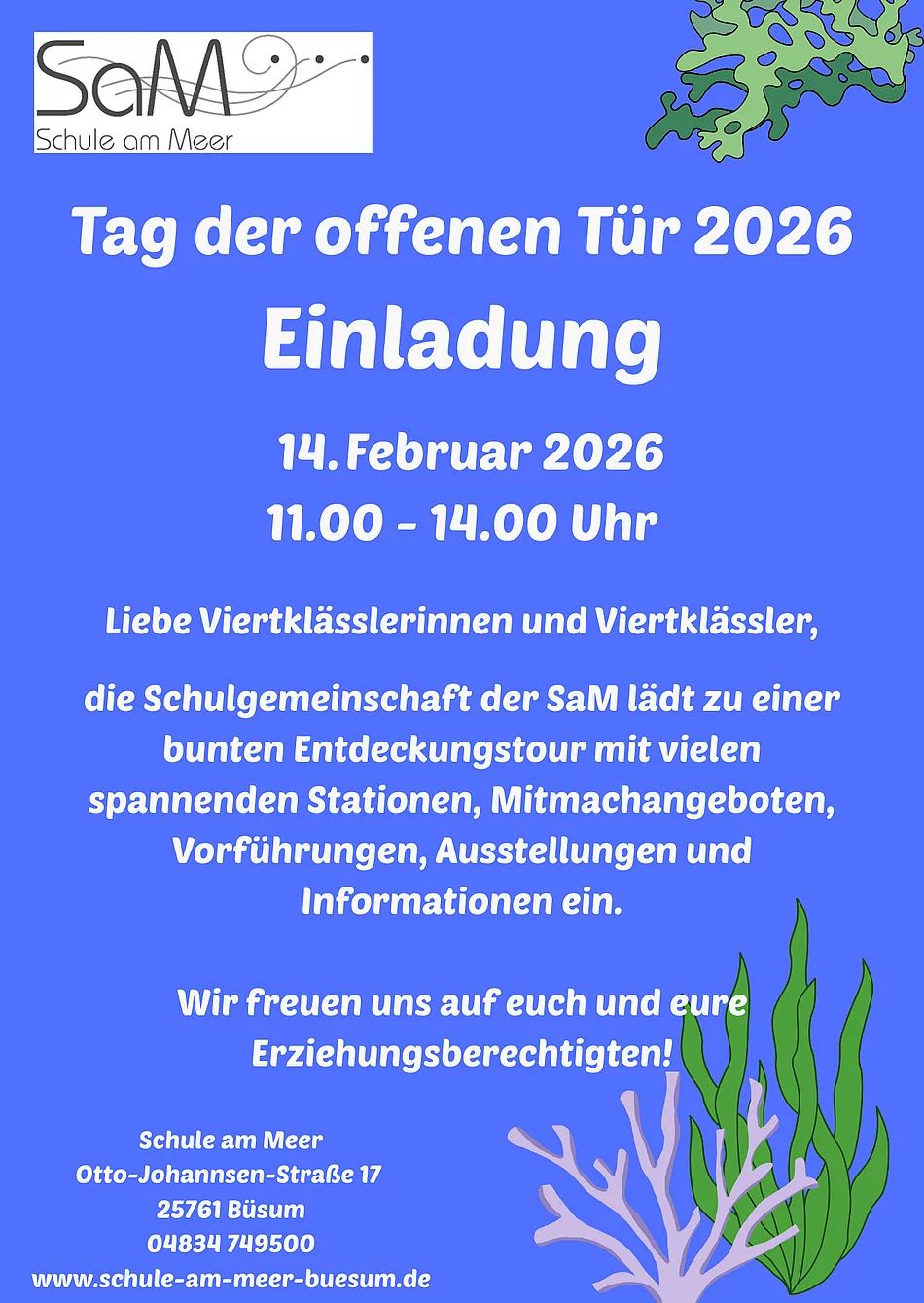 Die Schule am Meer stellt sich vor: Am Samstag, 14. Februar 2026, in der Zeit von 11.00 bis 14.00 Uhr haben alle, die im Sommer 2026 in die fünfte Klasse kommen, Gelegenheit, unsere Schule kennenzulernen.
