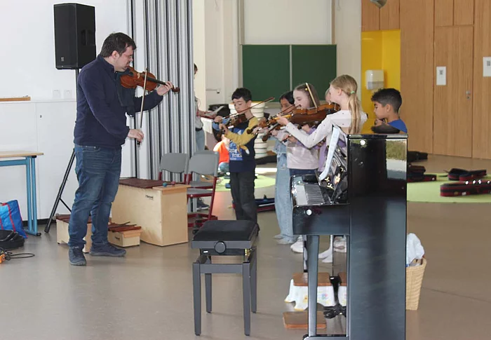 Am 29. April stellten die Drittklässler ihr musikalisches Können in der Aula des Grundschulteils unter Beweis. Sie zeigten vor einem kleinen Publikum, was sie bereits in den Musik-Projekten „Instrumentenkarussell“ und „JeKi – Jedem Kind ein Instrument“ gelernt haben. Unterstützt wurden sie dabei von einigen Viertklässlern, die schon sehr routiniert ein Instrument spielten bzw. sangen.