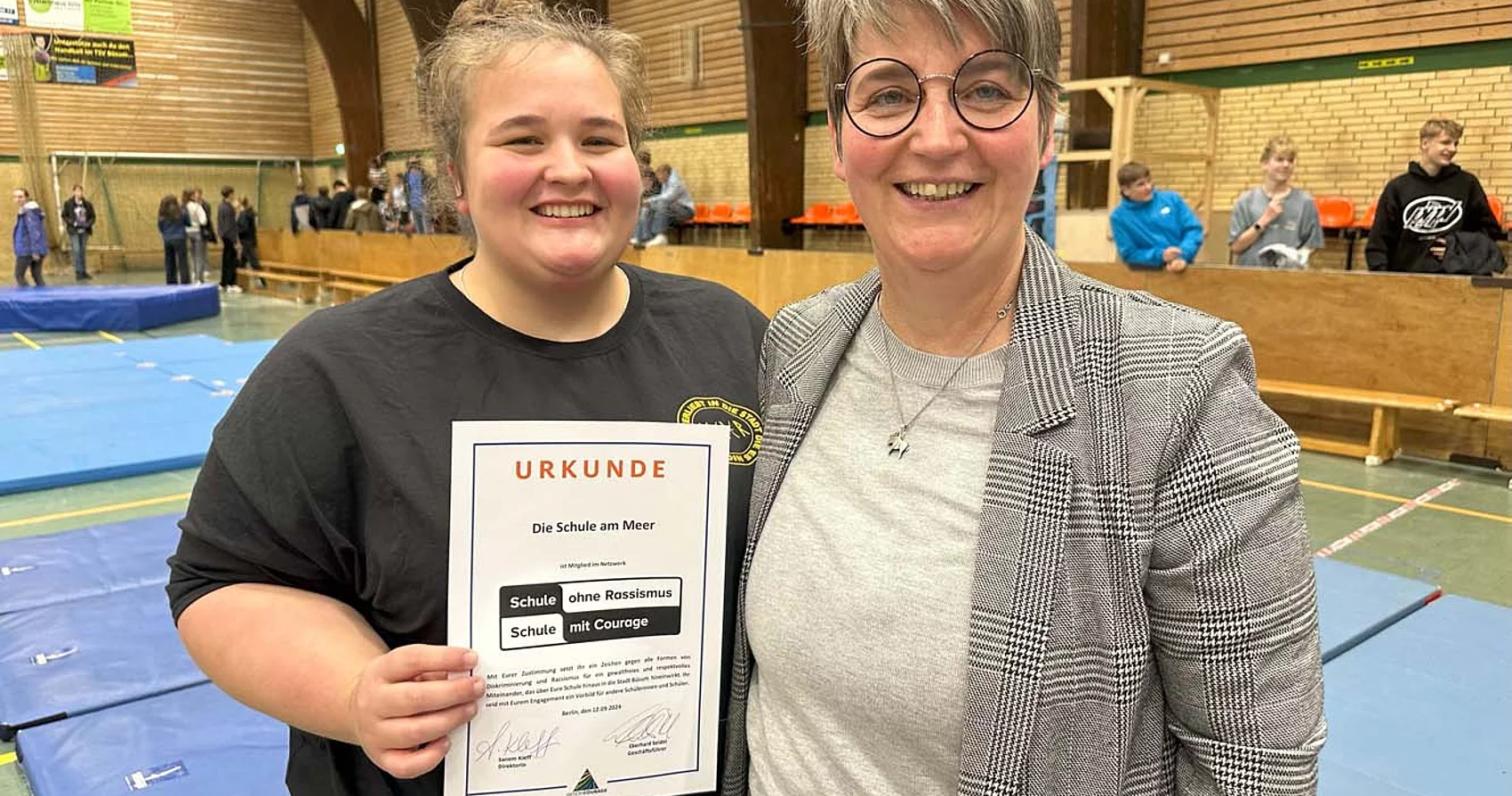 Die musikalischen und darstellenden Beiträge sowie die Reden der Schülerinnen und Schüler verdeutlichten, wie sehr sich die SaM für ein faires Miteinander einsetzt. Die feierliche Übergabe der Urkunde von Karla Müller-Helfrich, Regionalkoordinatorin des Netzwerks Schule ohne Rassismus- Schule mit Courage, ist ein weiterer Antrieb für einen aufmerksamen, fairen und noch toleranteren Alltag.