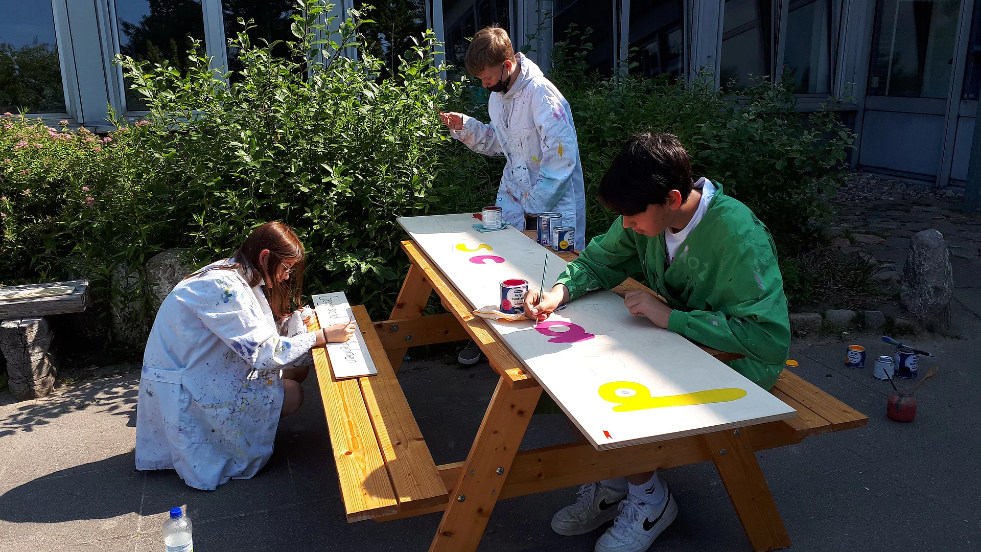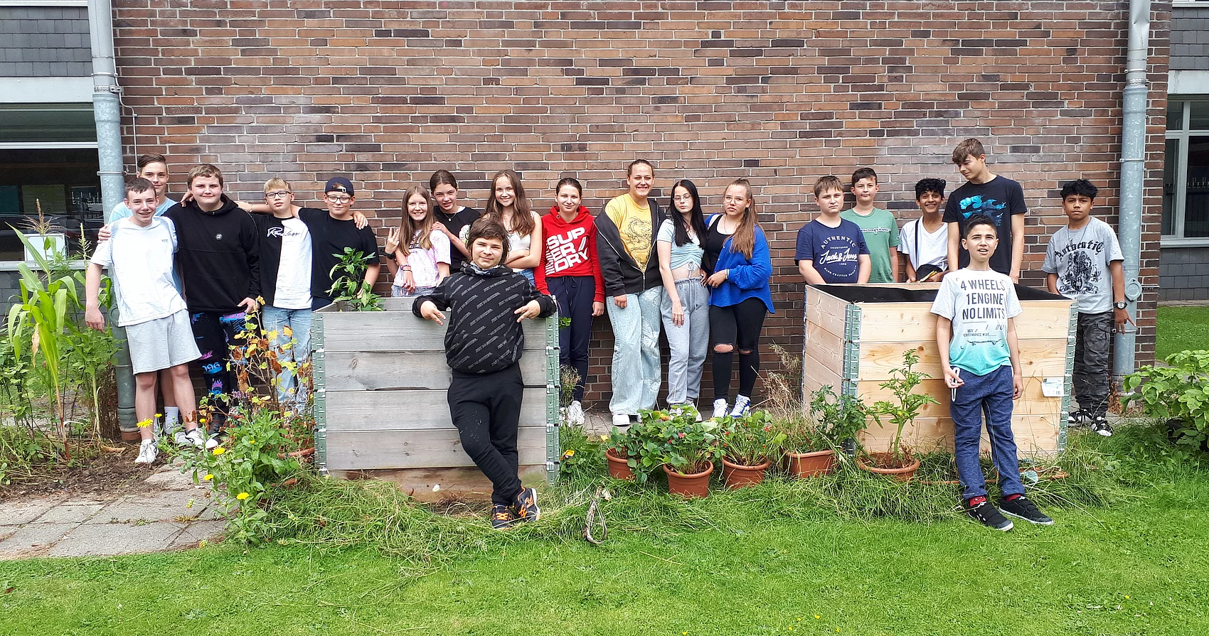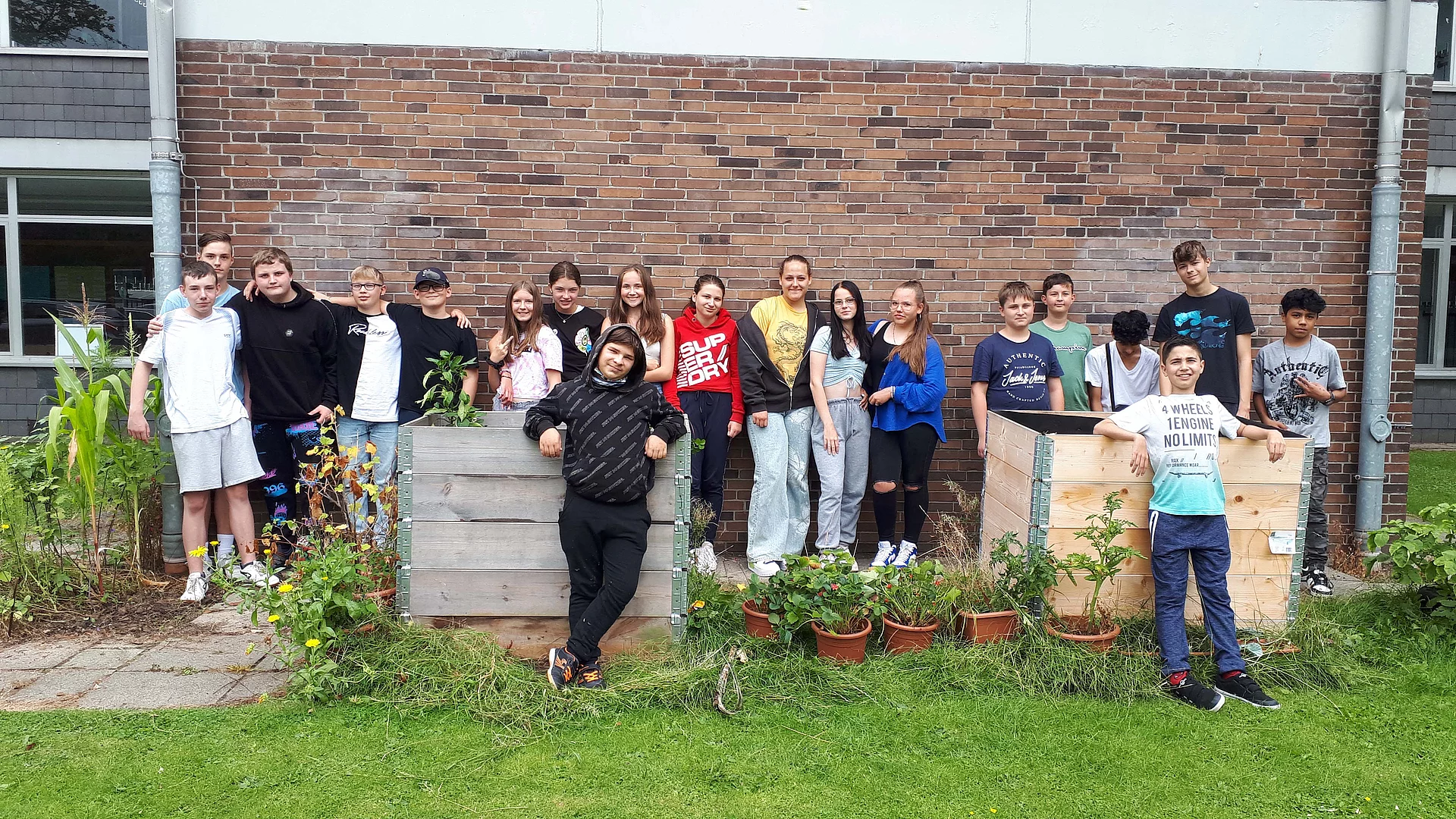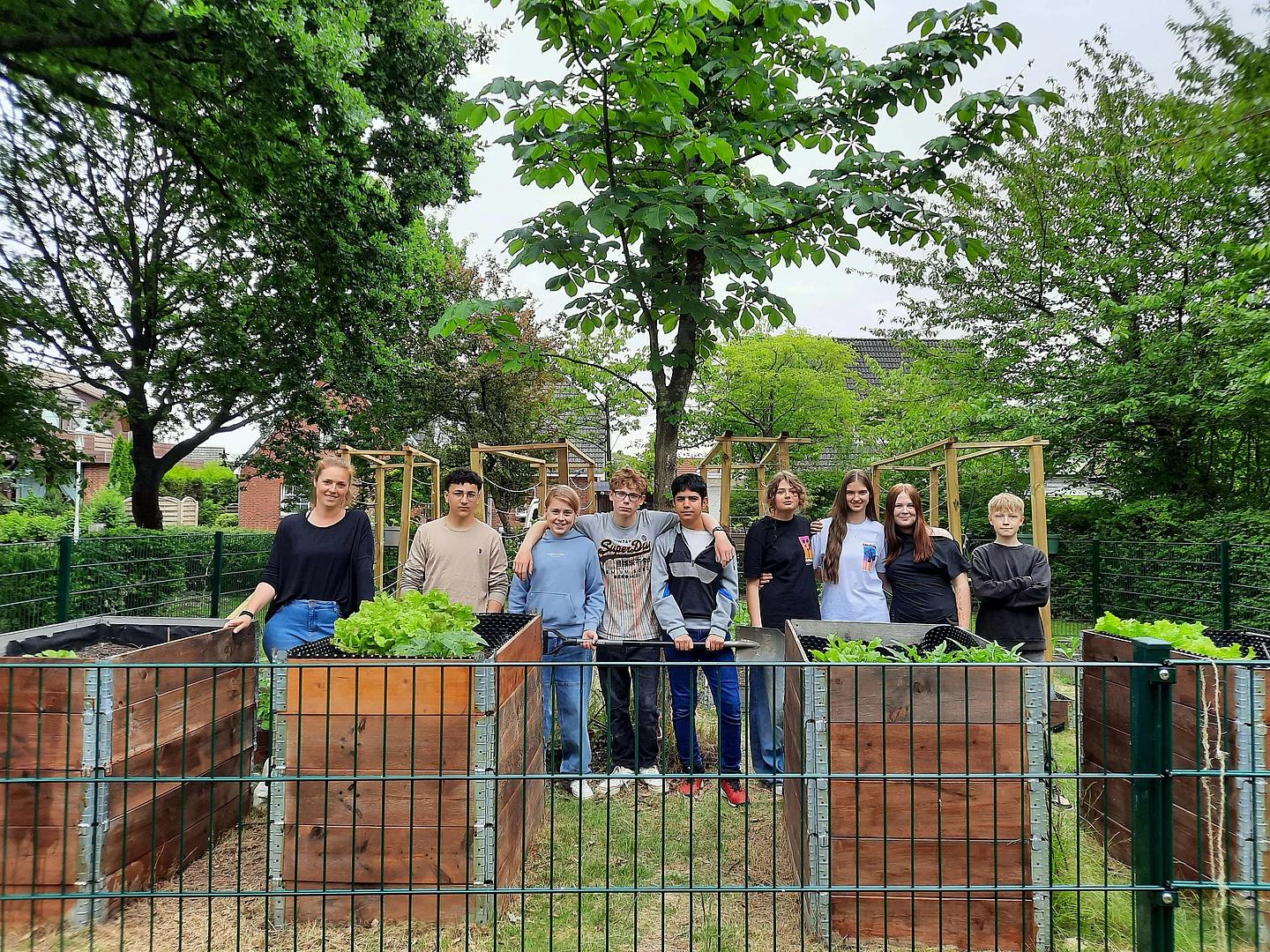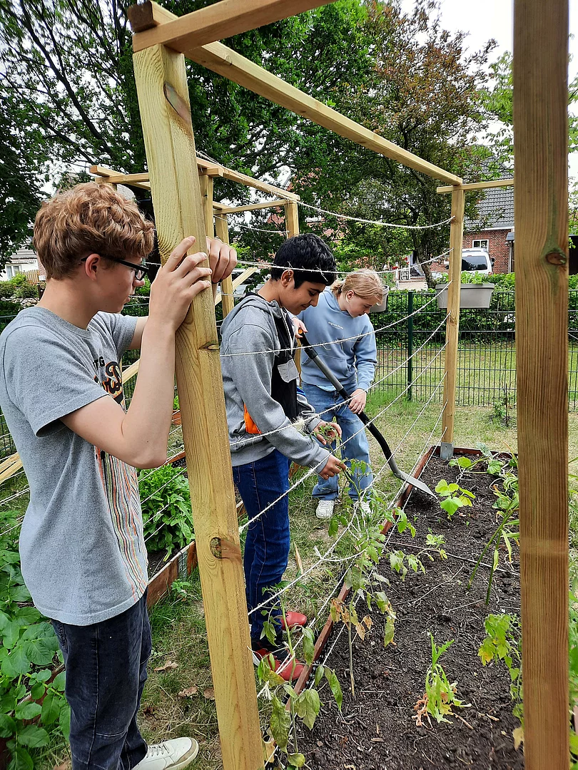Bis dahin war der Gemüsegarten frei zugänglich, was leider ausgenutzt wurde. An Wochenenden oder Nachmittagen kamen ungebetene Gäste mit Jutebeuteln vorbei und ernteten, was wir gesät hatten. Also musste ein Zaun her. Dieser wurde in diesem Jahr von unseren Hausmeistern aufgebaut. Auch die Tomaten und Gurken brauchten etwas mehr Stabilität, also bauten die SchülerInnen kurzerhand selbst Rankhilfen.