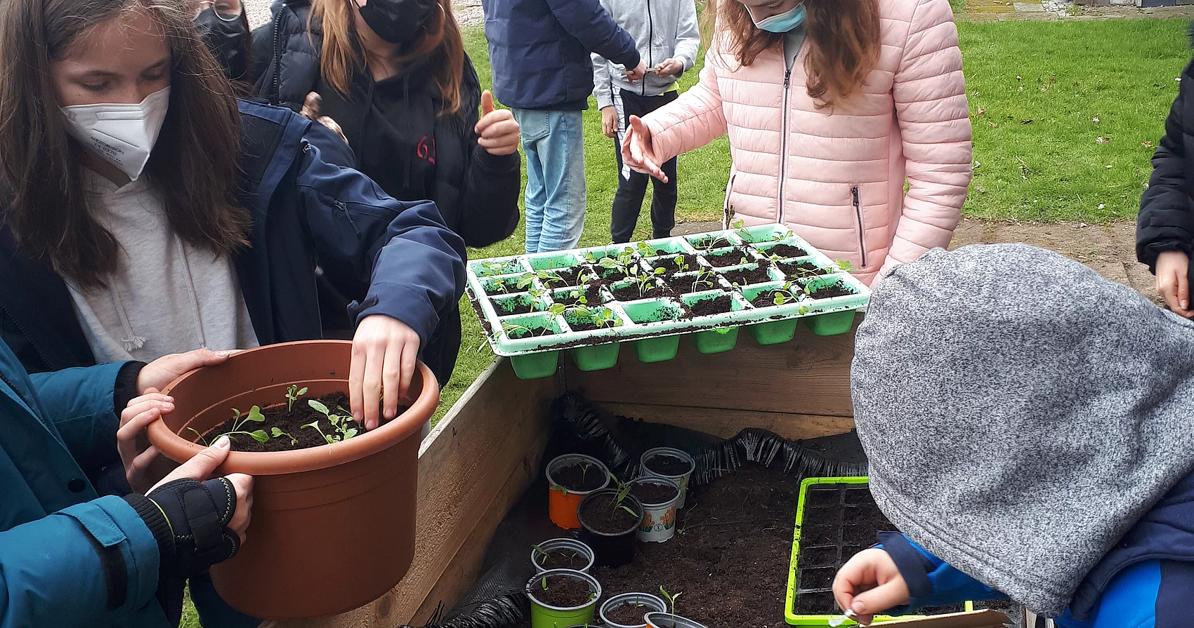 Doch bevor es an das Ernten oder Essen ging, waren viele Schritte nötig. Die Pflanzen wurden in kleinen Anzuchtkästen vorgezogen, später in Töpfe umgepflanzt und stetig mit Wasser versorgt. Hinzu kam, dass ein weiteres Hochbeet angeschafft wurde, welches die Schüler*innen aufbauten und mit viel Ausdauer mit verschiedenen Schichten befüllten.
