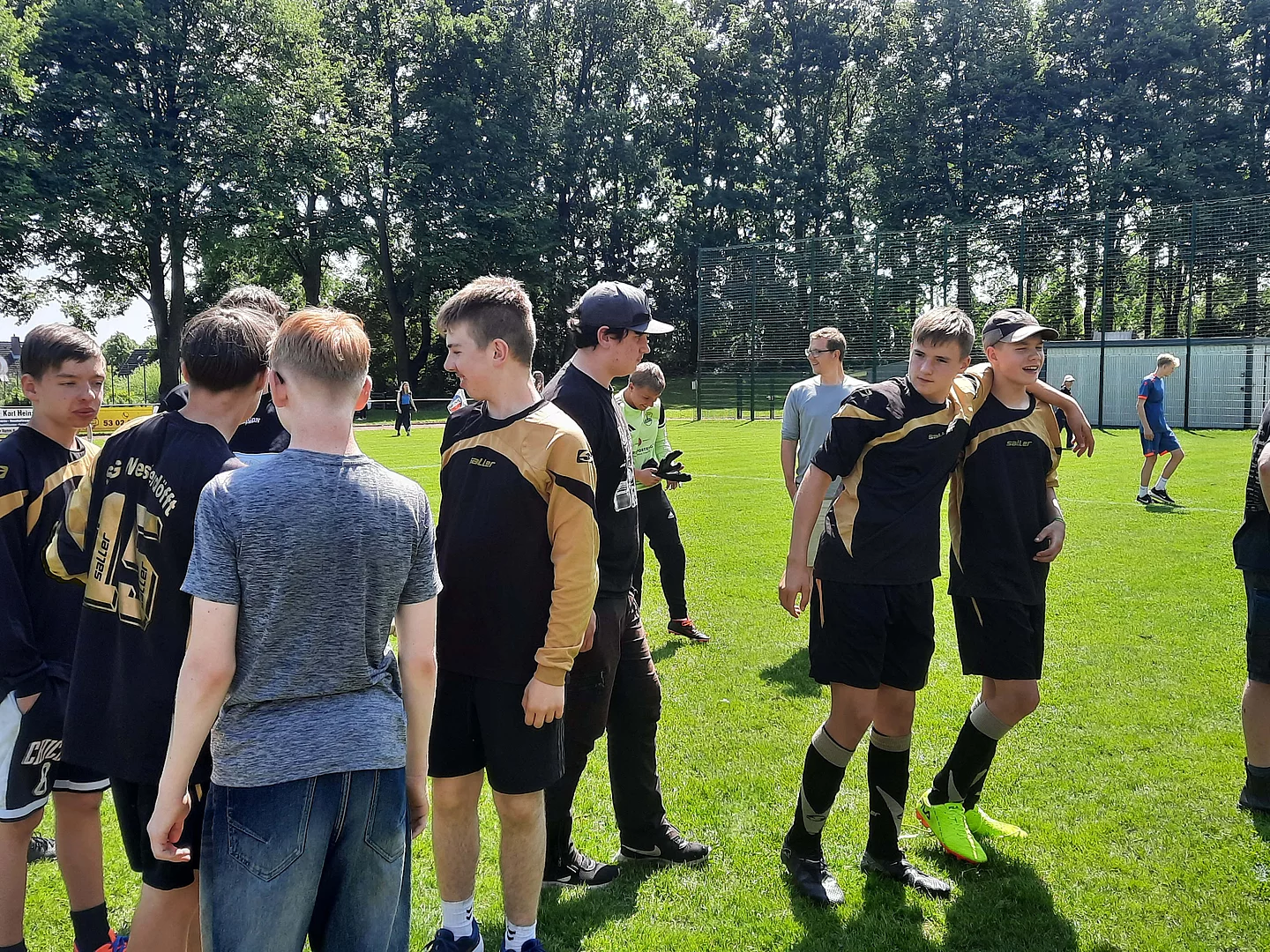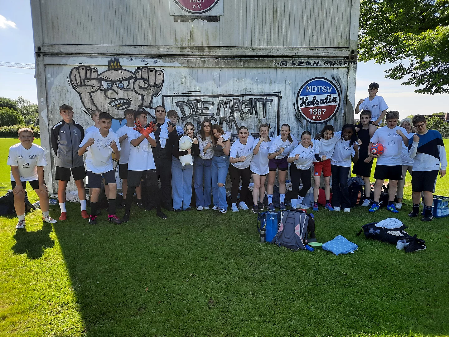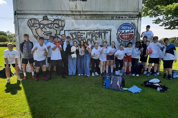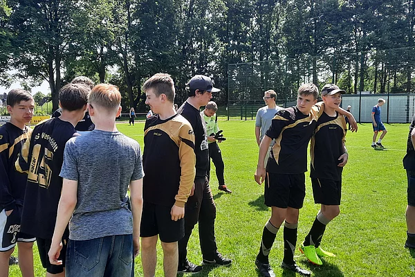 Also ging es eines Morgens los nach Kiel. Natürlich fiel der erste Zug aus, sodass wir kurz umplanen mussten, aber am Ende klappte alles. Es war strahlender Sonnenschein und wir waren motiviert. Paul und Deik spielen Fußball im Verein. Sie sollten das Spiel auf dem Feld leiten (wobei Paul als Teamkapitän beschlossen wurde). Frau Colmsee war unser Coach und bestimmte wer spielen durfte. Frau Wien war unsere Motivatorin, feuerte uns an und feierte uns bei guten Aktionen. Allerdings hatte Paul sich im ersten Spiel direkt eine leichte Zerrung geholt und konnte nicht mehr 100% geben, aber für das Team kämpfte er weiter. Deik war unser Dribbler. Mit seinen Flinken Füßen trickste er die Gegner aus. Nachdem unsere Mädchen ins Spiel gefunden hatten, wurden sie immer besser und konnten in der Abwehr einige Bälle ergattern. Fynn ist Torwart im Handball. Mit vollem Körpereinsatz verhinderte er mehrere Tore und erhielt von einigen Außenstehenden Lob für seine Leistung. Auch Ben, Kerim, Jerome (für das Turnier Thies getauft) und Jonas halfen immer wieder in der Abwehr und im Mittelfeld mit gutem Überblick. Unsere Teamleistung steigerte sich von Spiel zu Spiel. Am Ende war die Bilanz jedoch gegen uns. In der Gruppenphase verloren wir zwei Spiele, eins gewannen wir und ein Spiel verließen wir mit Gleichstand. Danach war erst einmal Mittagspause angesagt. Anschließend sollte verkündet werden wer es ins Viertelfinale geschafft hatte. Wir glaubten nicht daran, dass wir weiter waren. Es versammelten sich die Mannschaften unserer Gruppe auf dem Feld in einem Kreis. Der Veranstalter erklärte uns, dass die Leistung im Fußball zusammengerechnet wurde mit der Leistung des abgegebenen Videos. Unsere Hoffnung sank noch weiter. Aber wir wurden überrascht! Wir konnten es gar nicht glauben, aber durch das gute Ranking des Videos schafften wir es in die K.O.-Phase. Wir jubelten und Frau Wien war nicht mehr zu bremsen!