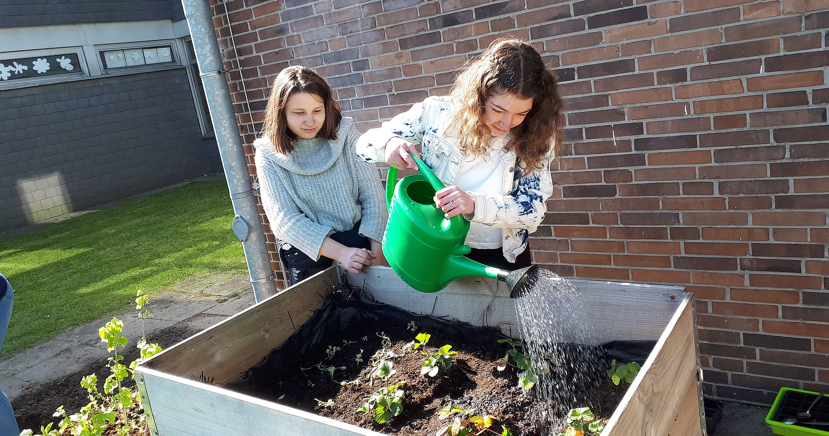 Seit nun zwei Jahren baut der siebte Jahrgang im Fach Verbraucherbildung Gemüse und Obst an. Zu Beginn brainstormen die Schüler*innen welche Gemüse- und Obstsorten in Deutschland wachsen können und wählen dann selber aus, was angebaut werden soll. Dieses Jahr fiel die Wahl auf Erdbeeren, Kohlrabi, Möhren, Gurke, Mais und Radieschen. Ein paar Tomaten, Zucchini und Pflücksalat schummelten sich ebenfalls in das Gemüsebeet.